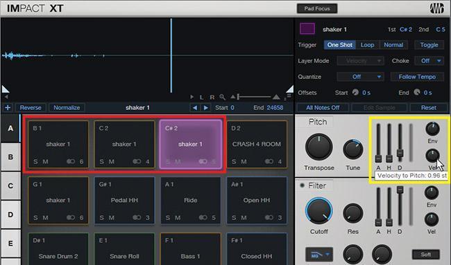A major buzzkill with electronic drums is hearing the identical sound over and over, but we can fix that. For example, to play a two-hand shaker part with only one shaker sample, copy the sample and detune it by 30 cents (or more) to provide a slight sonic variation (fig. 2). Detuning can also create a family of cymbals or toms from one cymbal or tom sample. And alternating snare drum roll hits to snare drum samples with slightly different pitches can give a much more realistic sound.