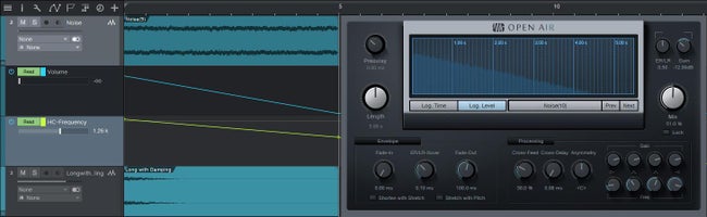 In figure 3, white noise is loaded in the top track in Studio One. One automation lane creates the amplitude change; the other pulls down the frequency of a high-cut filter. The bounced result is in the lower track. The Open Air reverb (inserted in an instrument track) makes for easy testing, because it’s possible just to drag the bounced file into the Open Air impulse window to hear the result.