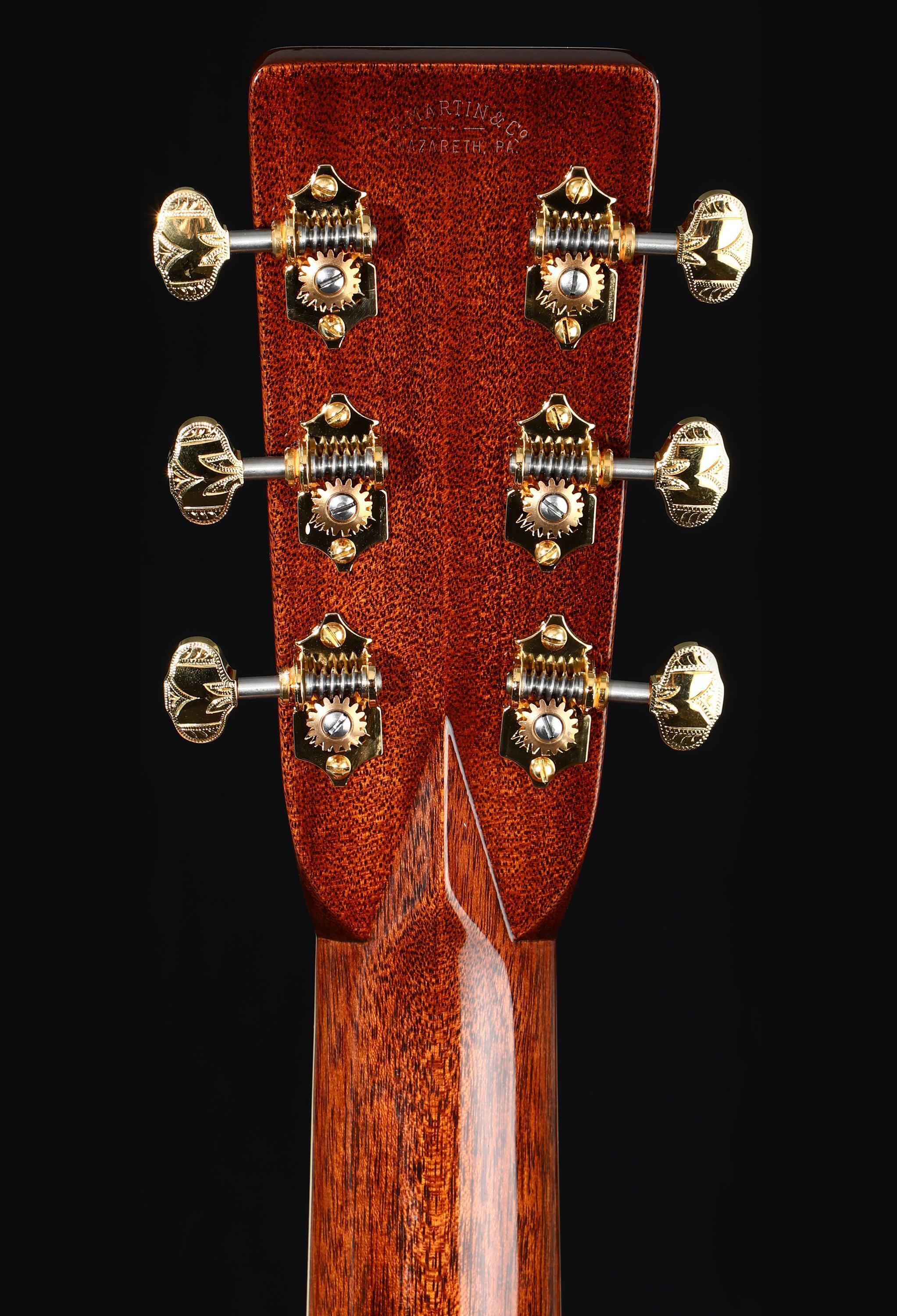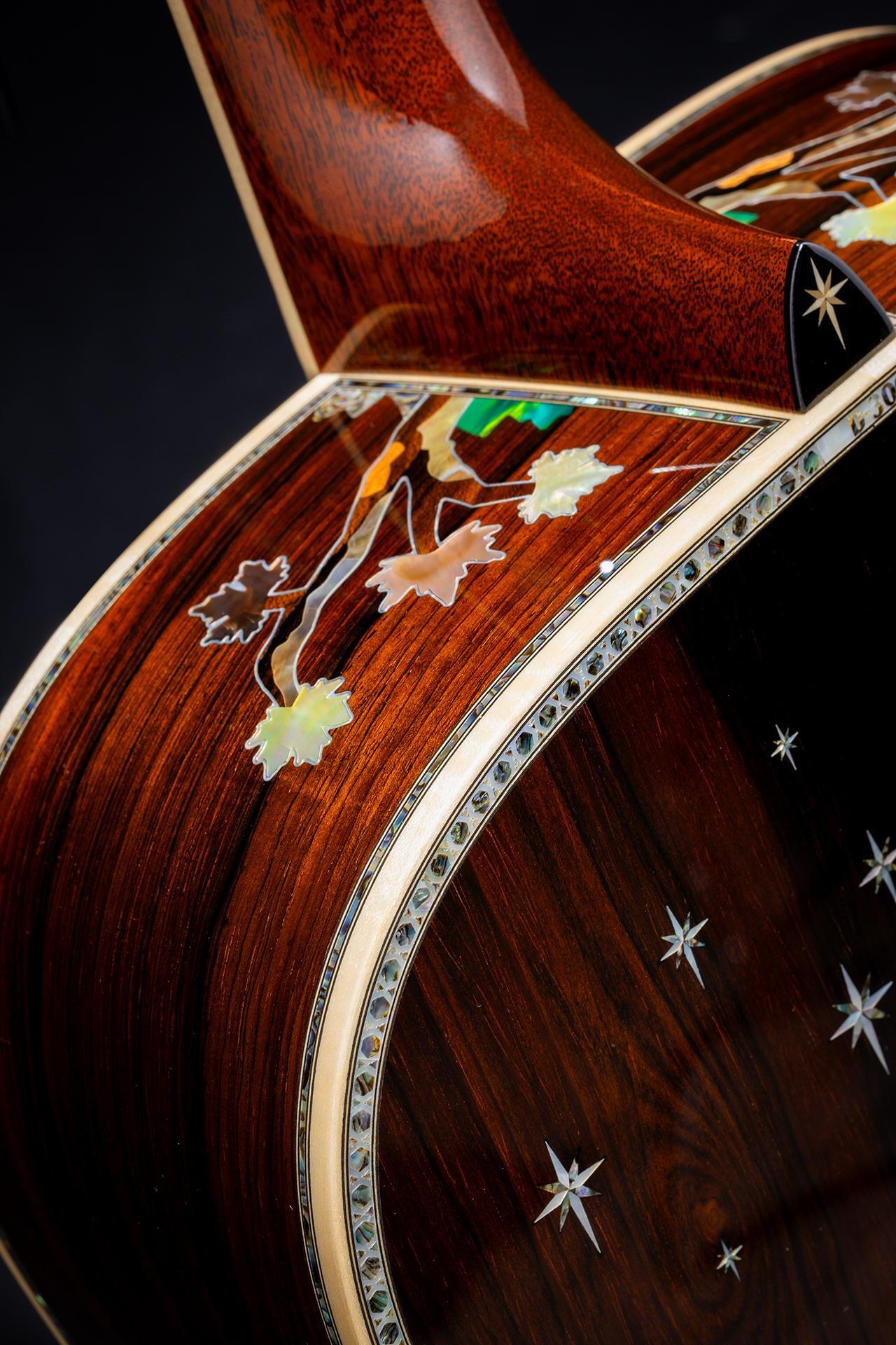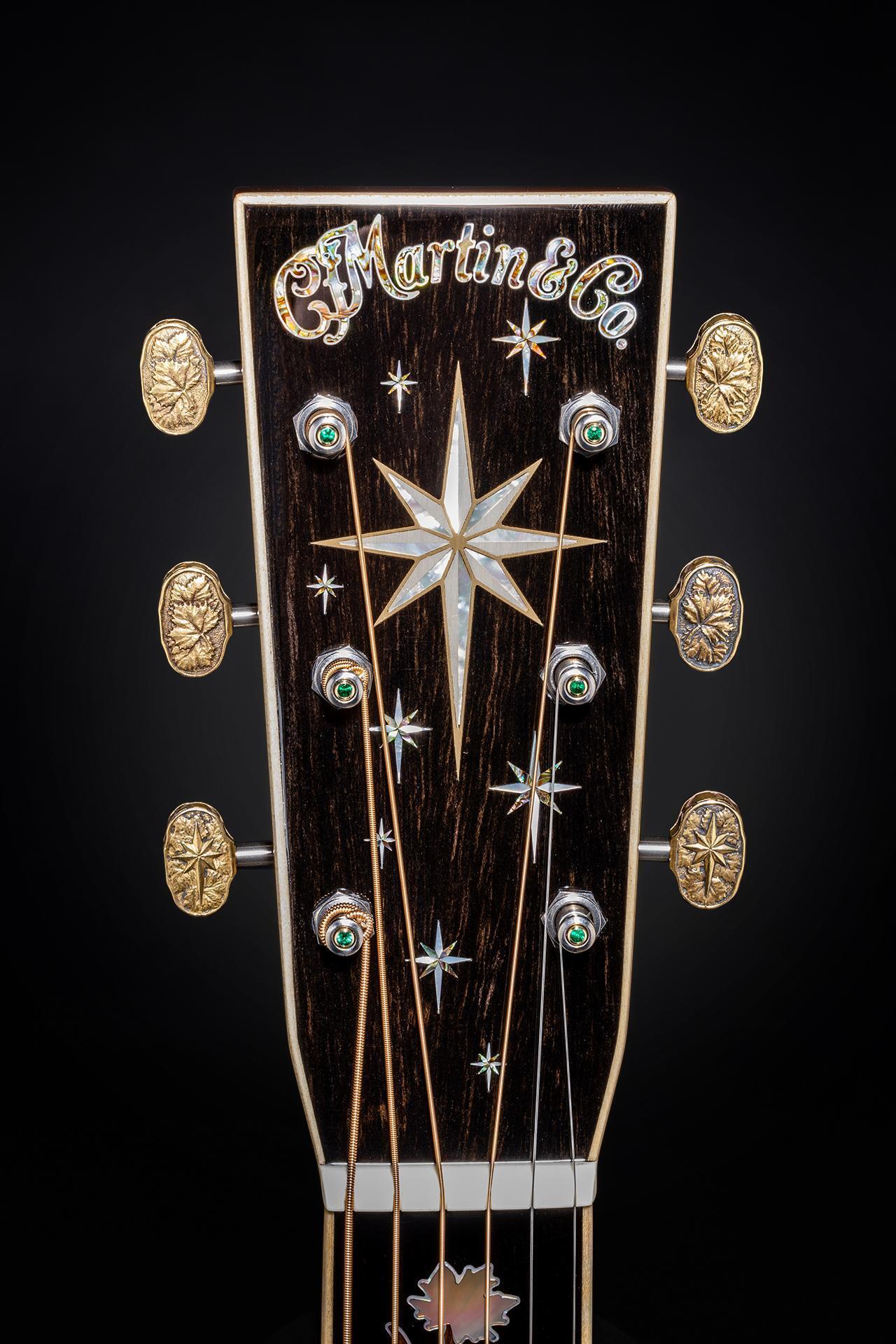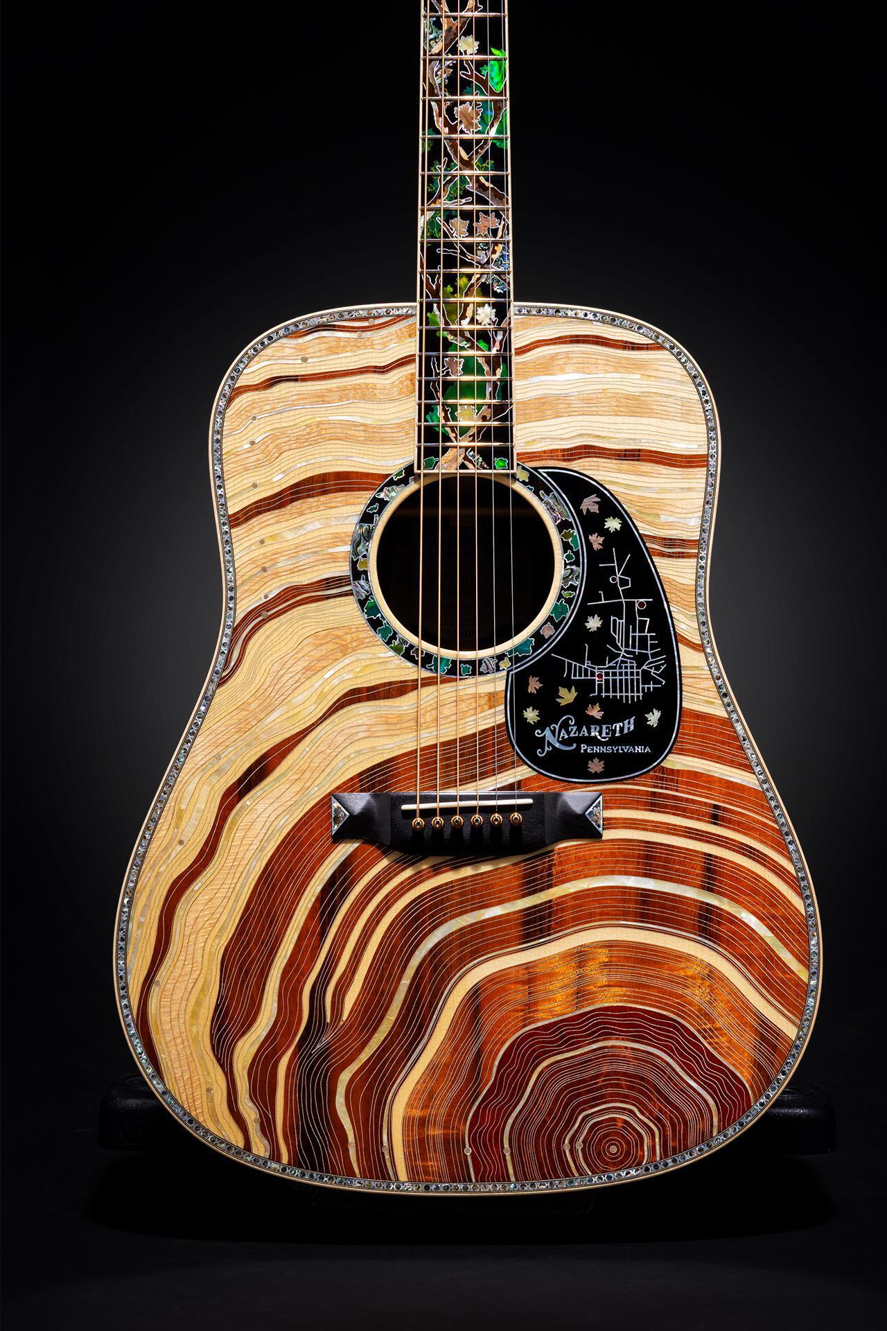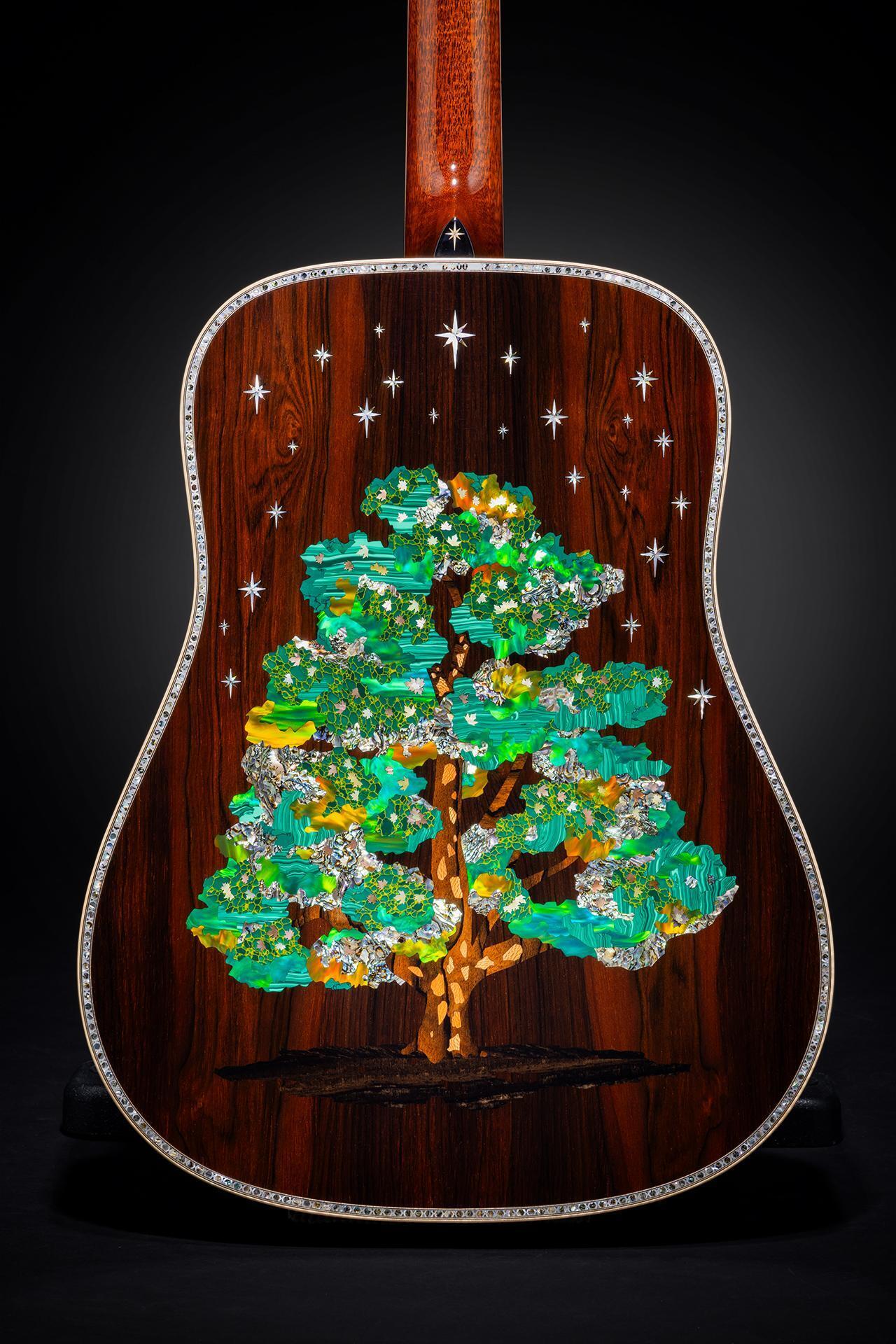 One of only 30, this guitar’s focal point is a unique top that tells the story of Martin’s extraordinary, 192-year history through the rings of a tree. Gold dots delicately placed on the rings mark pivotal moments in Martin’s past. The ebony pickguard shows a map of Martin’s Nazareth, PA, locations with rubies marking the points of Martin’s three historic factories. An abalone sycamore-tree inlay on the back celebrates the generations of highly skilled employees who have helped build the Martin legend.