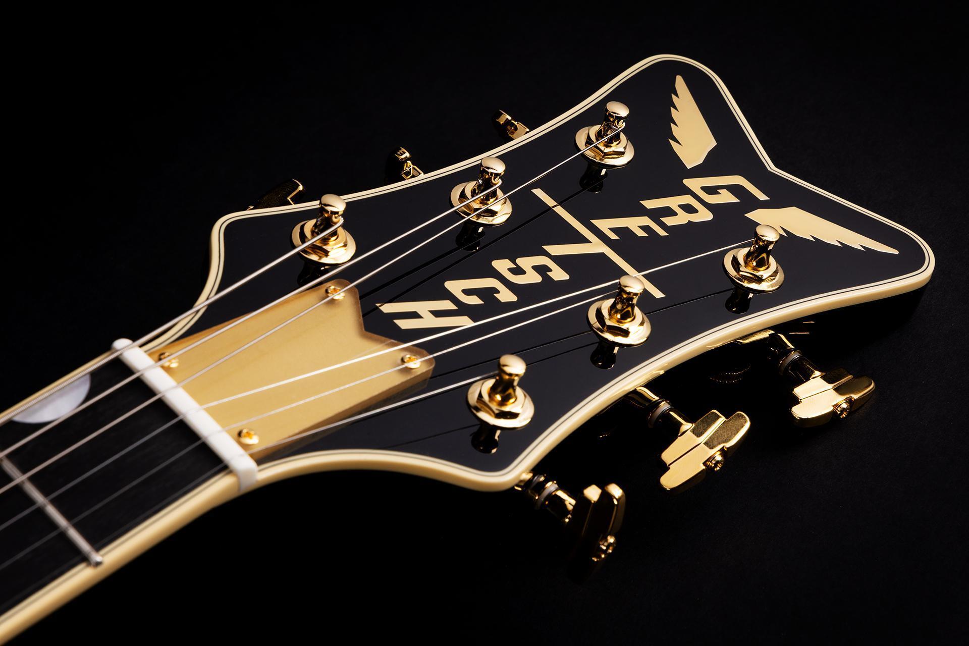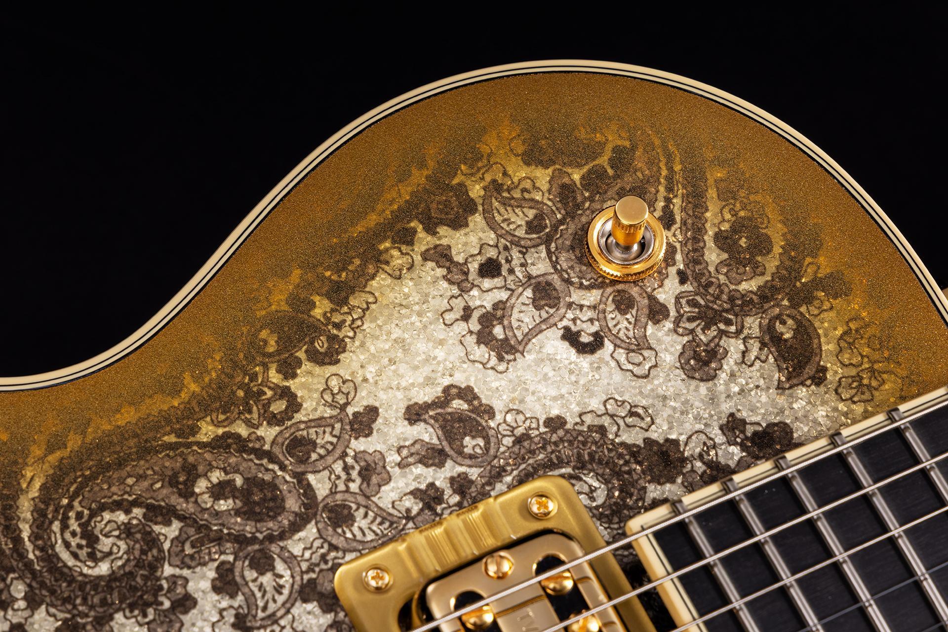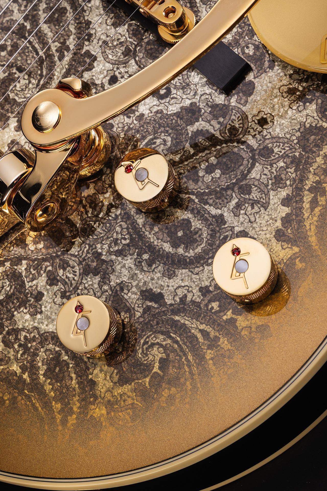 Originally created as a solidbody counterpart to the stunning White Falcon, the Penguin’s lineage reaches back to the dawn of rock ’n’ roll. This limited-edition model blends the best of the Penguin legacy with a unique paisley pattern peering out from beneath the gold edge burst. Additional features include TV Jones Filter’Tron pickups and a B3GP string-thru Bigsby tremolo.
