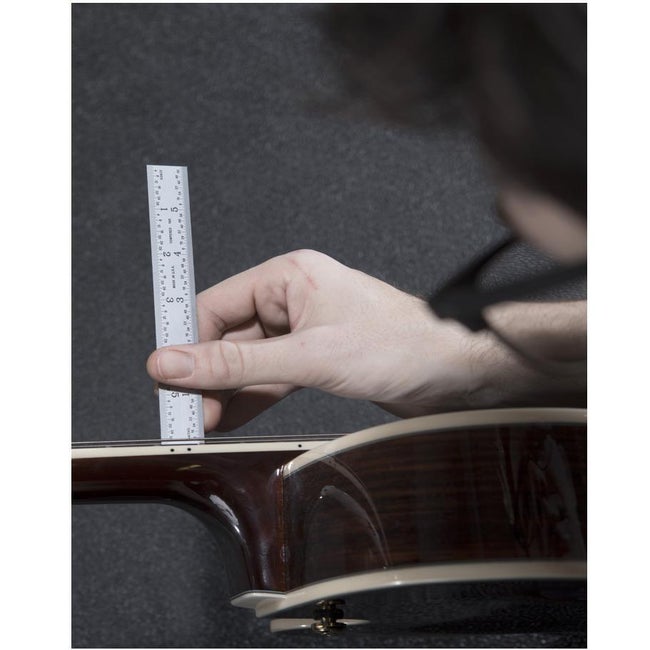 - With your ruler, measure the distance from the top of the 12th fret to the bottom of your lowest string. Guitar techs typically use small increments in order to be as accurate as possible. A ruler that’s graduated in 64ths of an inch is a great tool to keep in your gig bag or case.