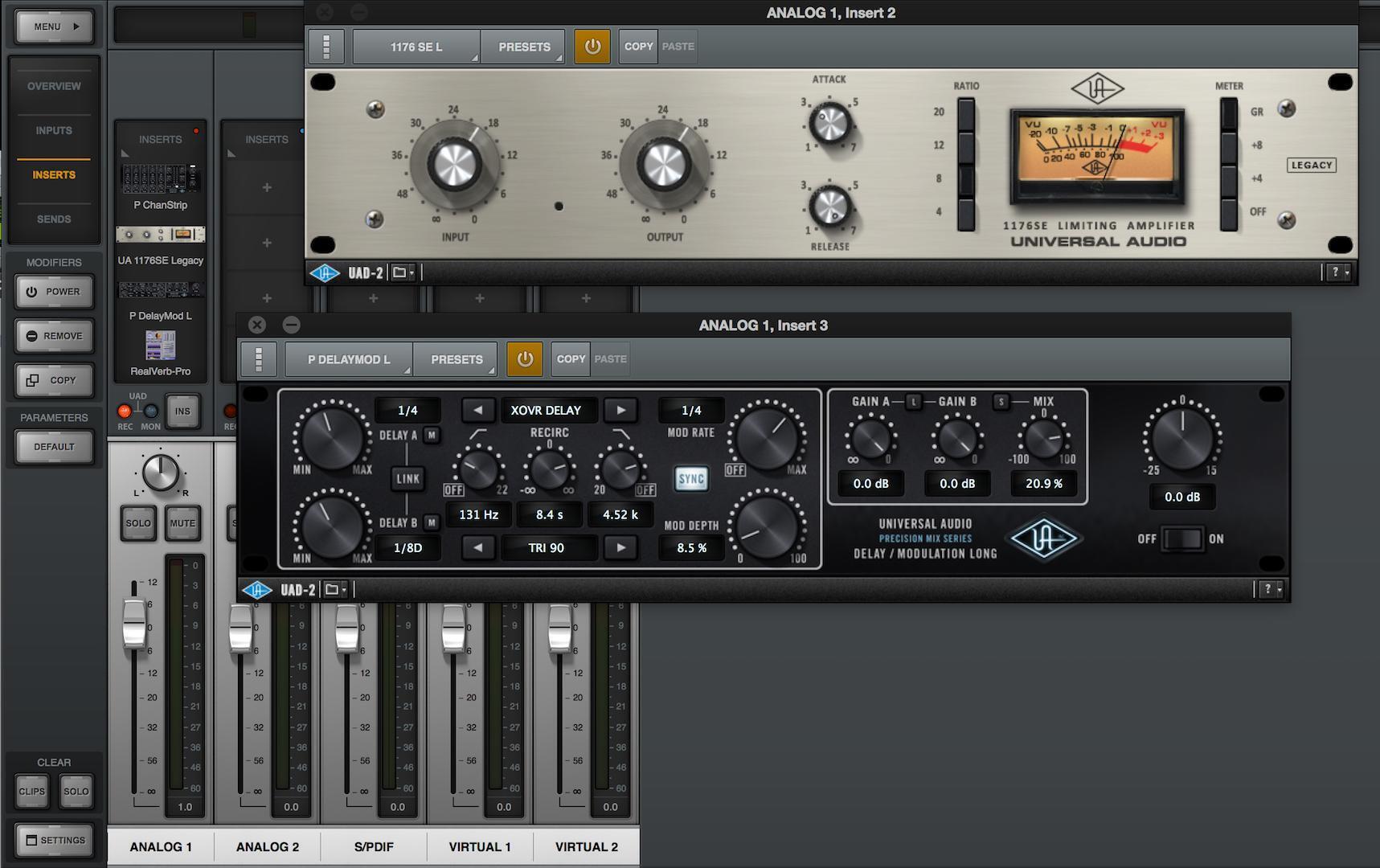 All of these sounds below were completely created by UAD plug-ins. I played guitar directly into the Hi-Z input on an Apollo Twin. All of the plug-ins were assigned to the Console app and committed to Pro Tools as I played. Physical signal chain: guitar, cable, Apollo. These examples were all recorded on a single channel of Pro Tools, so they’re mono.