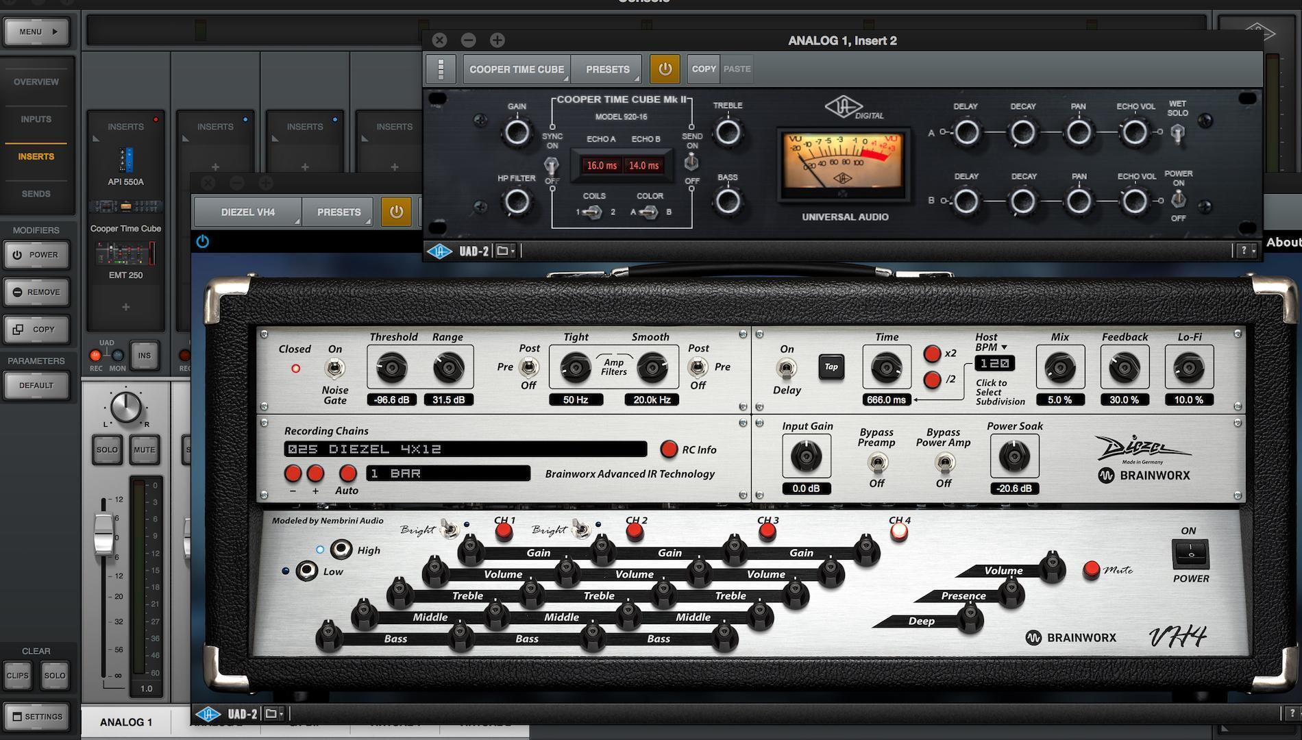 As you’ve probably found with most DAWs, recording with a plug-in — especially multiple stacked plug-ins — causes latency that is intolerable for getting a solid, tight performance. For myself, I record a take and do as few fixes as possible to give the performance an overall flow. That means guitar tone and latency are two really important factors. Killer amp sims and Unison technology take care of the tone factor, and the Apollo’s internal DSP ensures that the plug-ins assigned to the UA Console will not add any detectable latency. Per the Arrow‘s owner’s manual, “up to five UAD plug-ins can be serially chained on each input and aux return” with “sub-2ms round-trip latency… at 96kHz sample rate.” Bottom line: plug-and-play operation is worry-free.