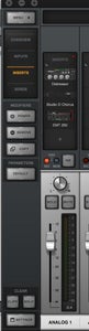 The other four plug-in slots are on the Insert page. These plug-ins have the option of either being recorded or monitored via a button located between the inserts and the pan knob on the channel strip. A red LED indicates “Record” and a blue LED indicates “Monitor,” as seen on the channel strips below.