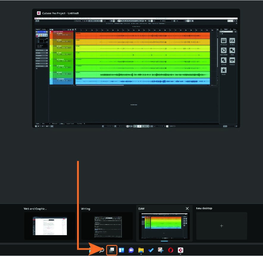The Virtual Desktop allows you to arrange all of your applications into separate desktops to make your workflow more streamlined. This is something I use quite often as not only does it help organize all of your applications, but it also helps you focus on one particular thing and not get distracted. For example, I have three virtual desktops set up on my studio computer — one for DAWs, one for writing, and one for graphic and web design. While Windows 10 had this feature, Microsoft has made it much easier to access in Windows 11.