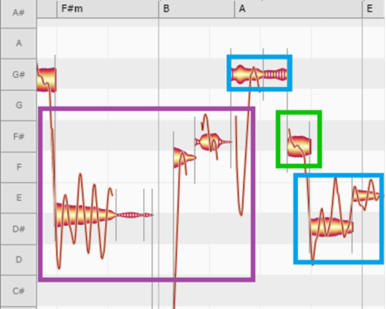“and I feel . . .” three times as the intensity builds in that part of the song. The notes are slightly sharp to add tension, with the biggest deviation in the second and third “and I feel.” Then, just before hitting the highest, perfectly tuned (green) note on the right to release, the green note just before it is slightly flat. Pitch “correcting” these nuances would nullify the emotional impact.
