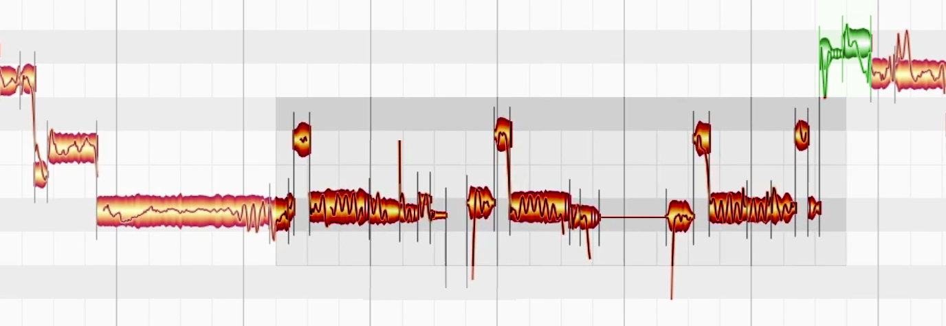 The notes on the left are tuned almost perfectly to a scale. The section colorized in red repeats