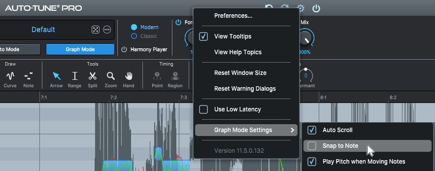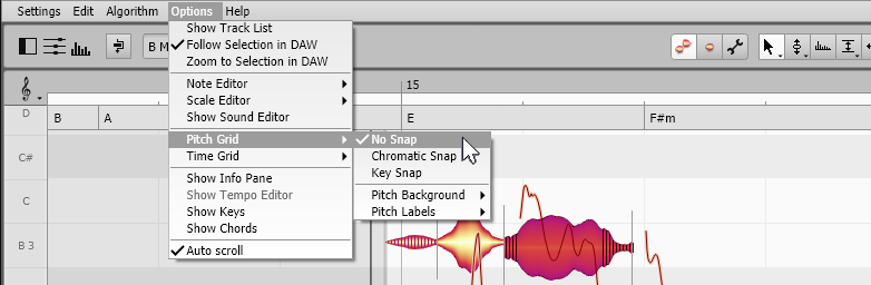 Most pitch-correction programs can turn off snap (figs. 3 and 4), so you can adjust pitch manually. It’s important to hear the note pitch as you move it. For example, in Auto-Tune Pro, check “Play Pitch when Moving Notes” under “Preferences.” With Melodyne, enable a track’s Input Monitor to hear the pitch changes. When the pitch soundscorrect, your edit is done.
