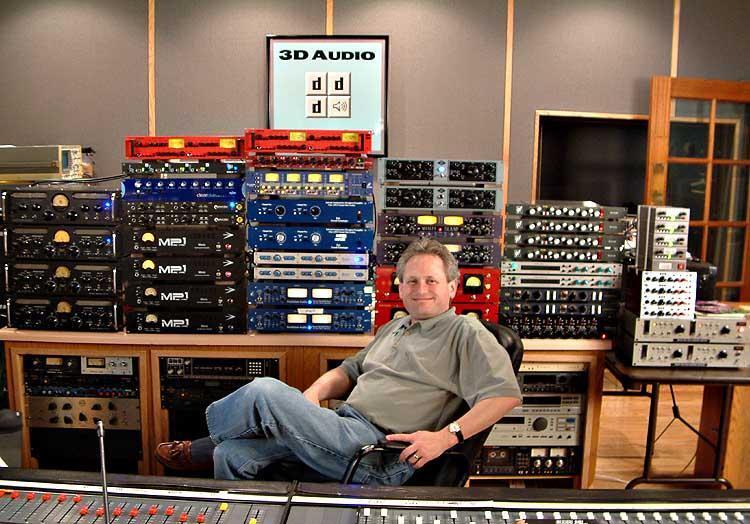 Lynn Fuston sitting in front of a wall of 24 preamps (x4) that he auditioned in 2004.