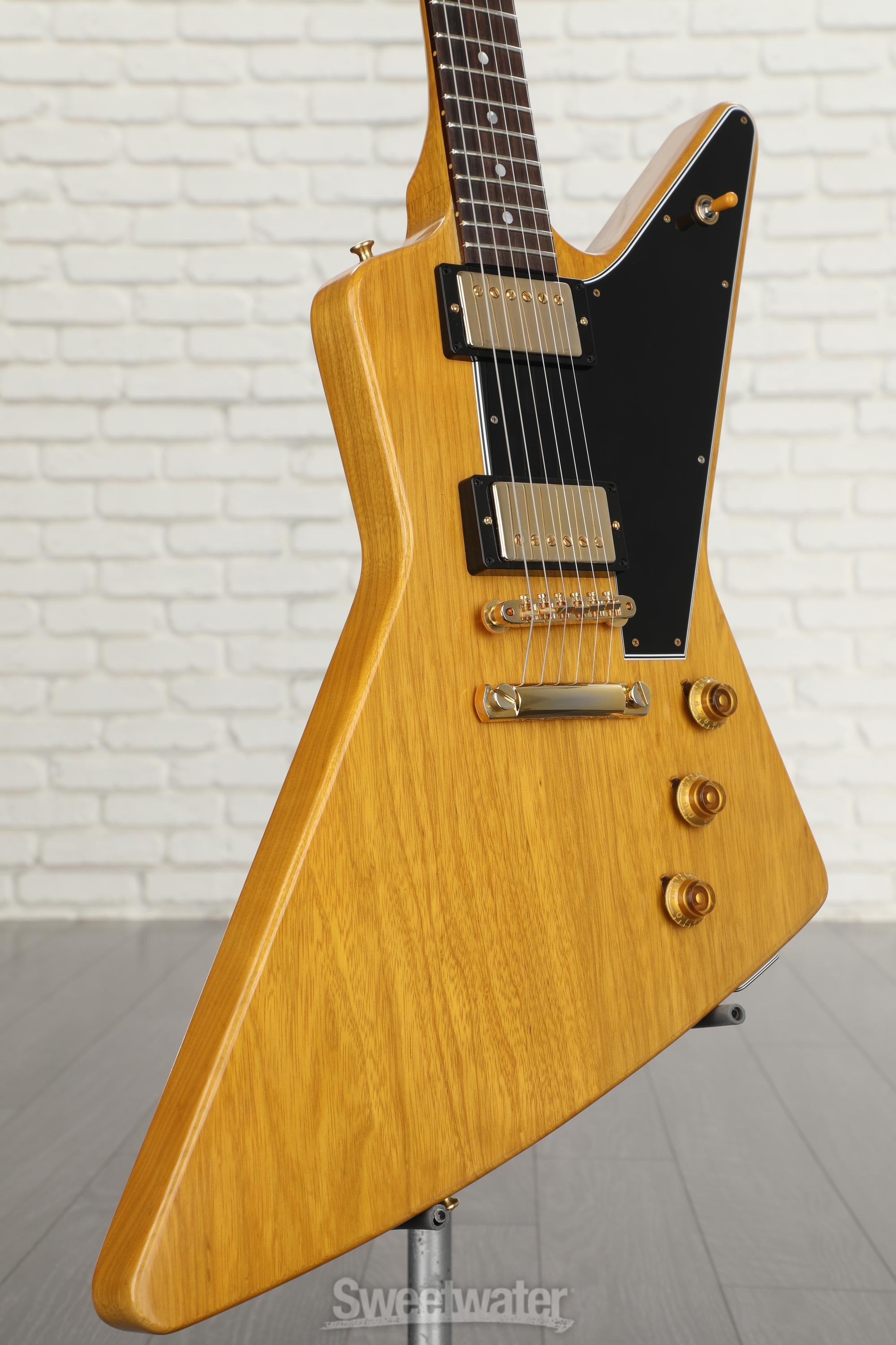 Back in 1958, Gibson shipped 19 Explorers — space-age, futuristic solidbody electric guitars that were well ahead of their time. The Gibson Custom 1958 Korina Explorer is a meticulous re-creation of this coveted axe, crafted using three-dimensional scans of museum specimens and rare collector's items. Every dimension and contour of this instrument reflects its predecessor; its 2-piece korina body, its solid korina neck, and its Indian rosewood fingerboard are spot-on reproductions of the originals. And when you plug in, Gibson's acclaimed CustomBucker pickups churn out vintage-accurate tones that are downright addictive. The 1958 Korina Explorer comes with a '50s-style brown-and-pink case.