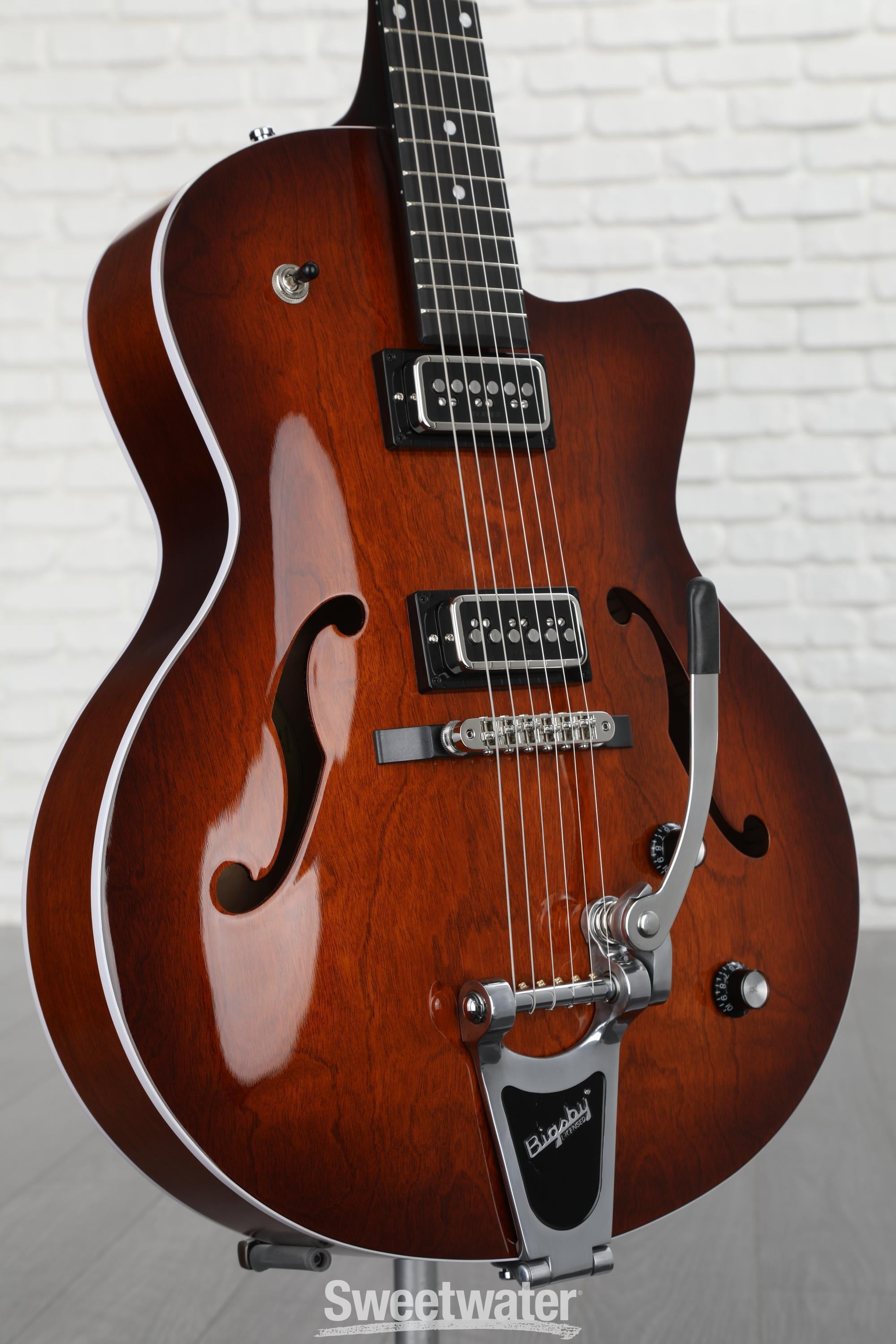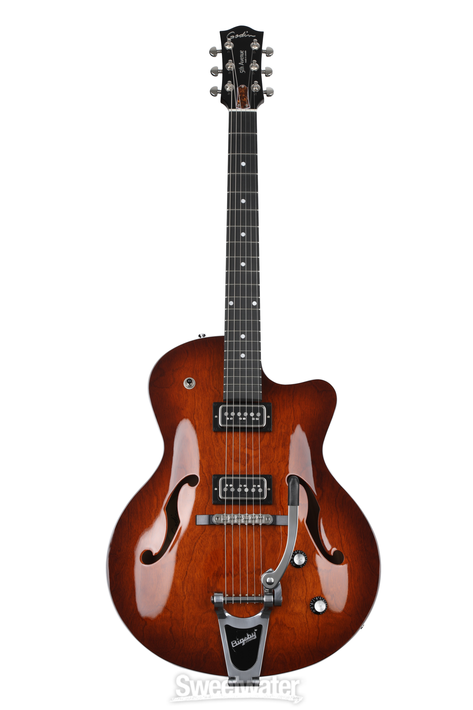 The Godin 5th Avenue Uptown T-Armond blends old-school archtop style with modern performance features to meet today's players where they live. A pair of TV Jones T-Armond "Dyna" pickups gives this beautiful archtop that coveted bygone-era bite and twang. You'll be greeted with rich tone and powerful projection the moment you pick up this ultra-light archtop; its Canadian wild cherry top, back, and sides are full of soul and stage appeal. Plugged in, the 5th Avenue Uptown T-Armond exhibits inspiring depth, clarity, and kick, with more than a touch of that vintage sparkle and chime. At the bridge position, a genuine Bigsby trem equips the 5th Avenue Uptown T-Armond for haunting chordal and melodic textures to deep scoops and wild dives — all without wrecking your tuning. If you're looking for a full-featured archtop with style and performance to match, be sure to check out the Godin 5th Avenue Uptown T-Armond from Sweetwater.