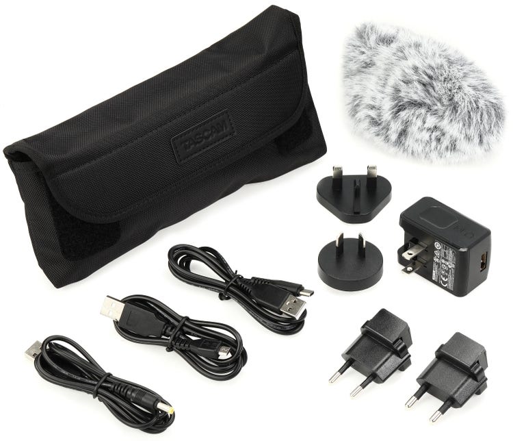 Accessory Pack for Tascam DR Series Recorders with Power Adapter, 4 Plug Fittings, 3 USB Types, Windscreen, and Portable Soft Case