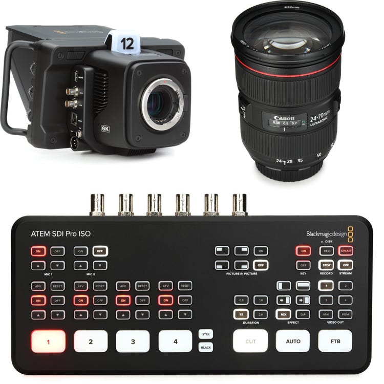 6-channel Video Production Studio with Livestream via Ethernet Hardware, Remote-control 6K Studio Camera with EF Lens Mount, and Full-frame EF-mount Camera Zoom Lens - 24-70mm, F2.8 (Fixed)