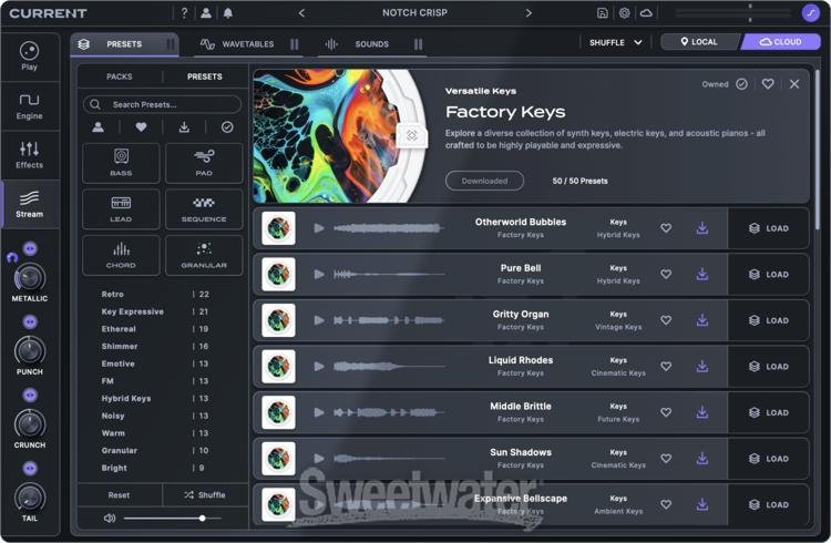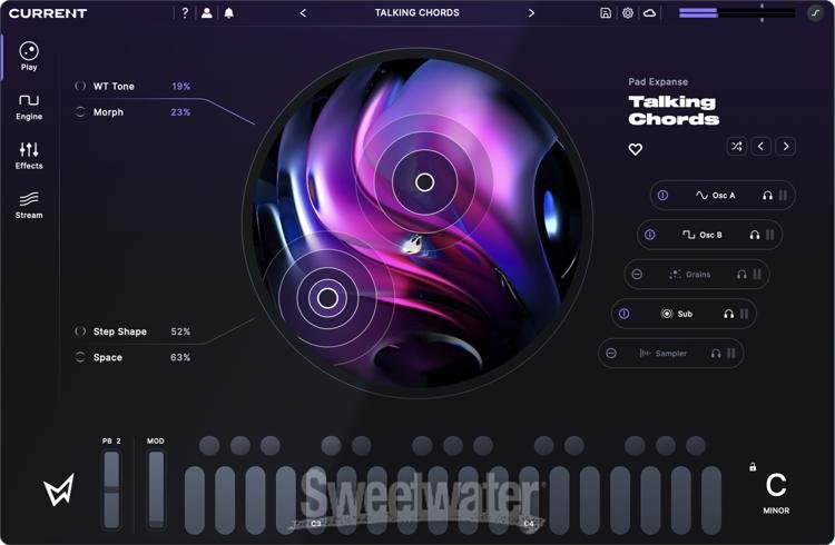 Speaking of movement, Current's onboard arpeggiator, featuring more than 40 melodic and rhythmic modes, invites immediate dynamics to any track. It also includes a flexible chord generator with over 30 presets and routing ability for entirely creative compositions within a single sound.
