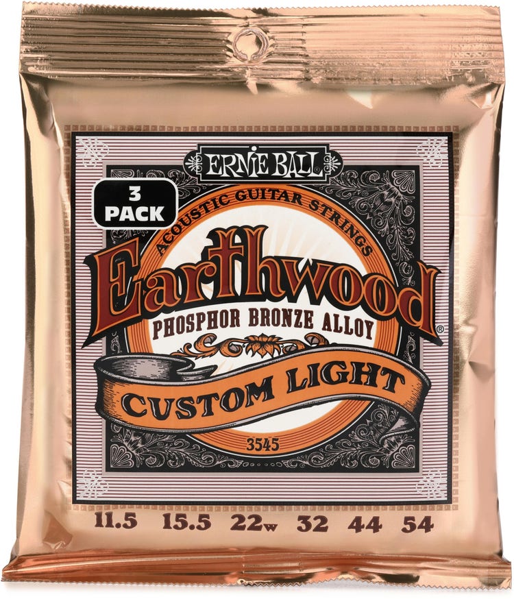 Ernie Ball 3545 Earthwood Phosphor Bronze Acoustic Guitar Strings - .0115-.054 Custom Light (Factory 3-pack)