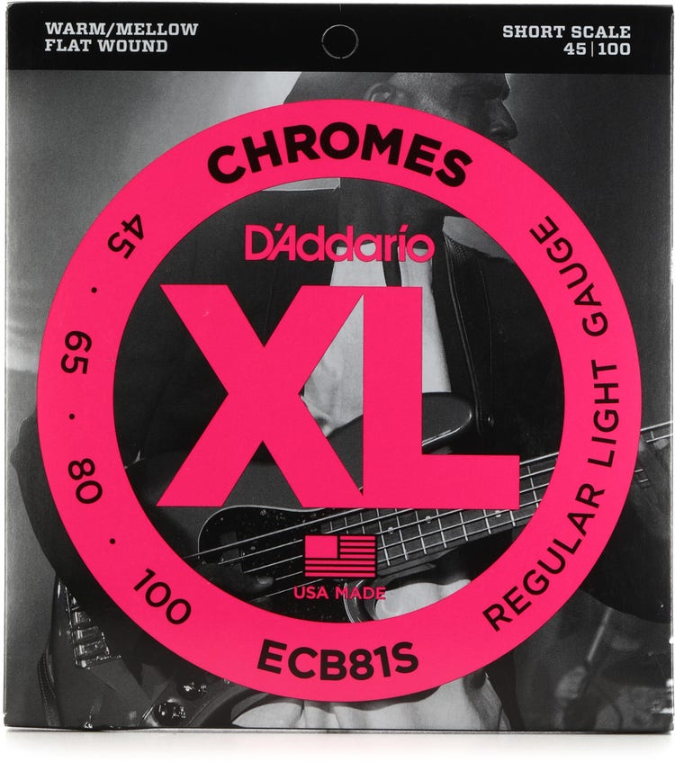 D'Addario XL Chromes Flatwound Bass Guitar Strings -.045-.100 Regular Light, Short Scale