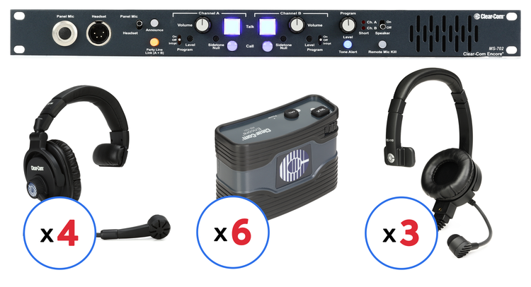 2-channel Main Station, (6) Single-channel Standard Beltpacks, (7) Single-ear Headsets