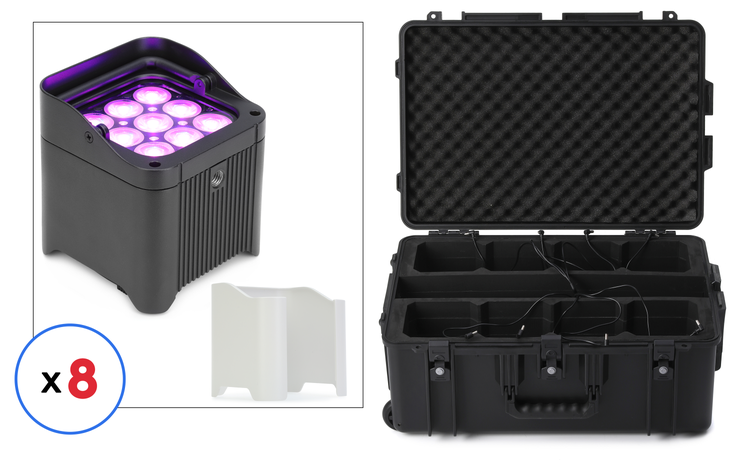 (8) Battery Powered, Wireless Quad-color LED PAR Lights with DMX, D-Fi, and RF Remote Control, TRUSST Compatibility, OLED Screen, Magnetic Diffuser, (8) white Cast Aluminum Sleeves, and IP65-rated Road Case with Wheels and Built-in Power Cables For Charging