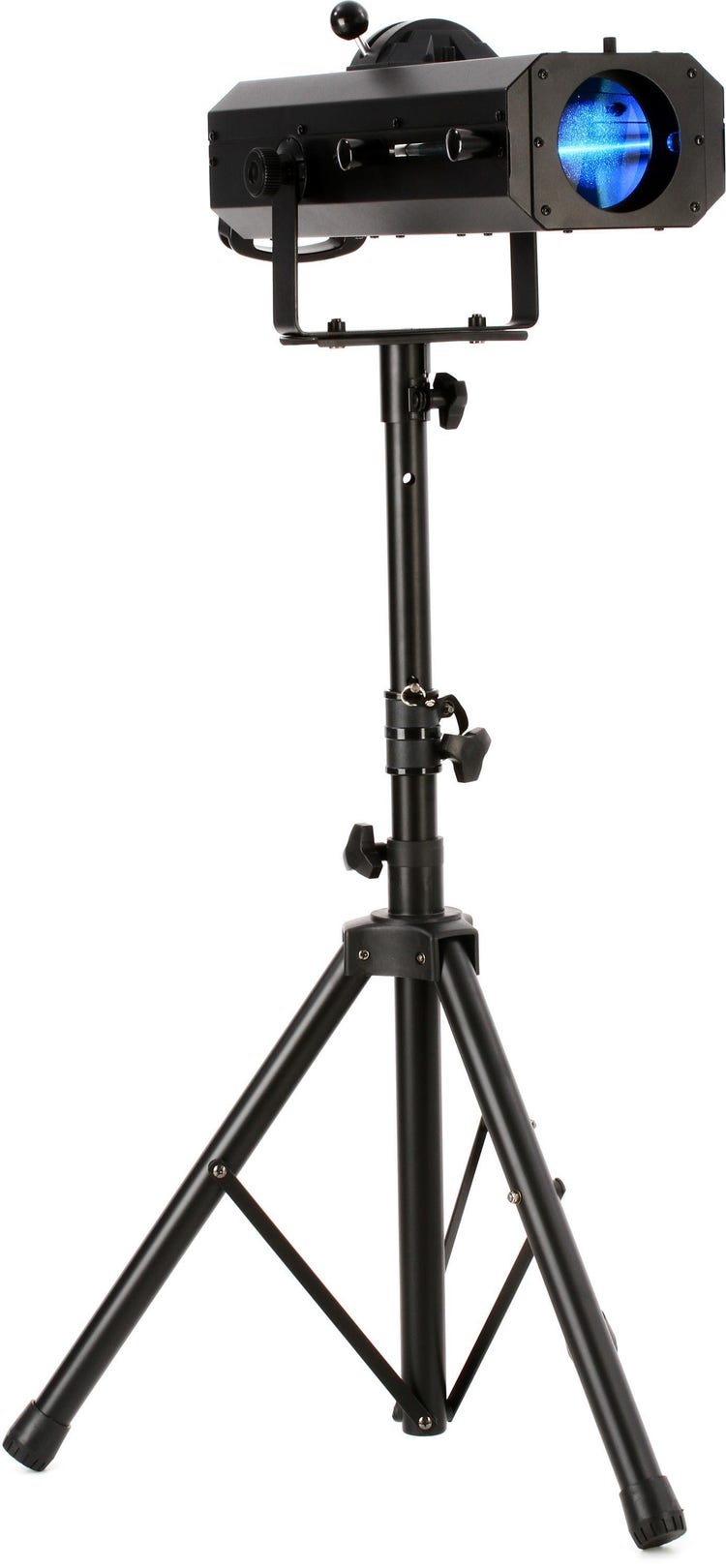 LED Followspot Lighting Fixture with 1 x 75W White LED, 8 x Color Options, 1 x Gobo Holder, Mechanical Iris and Lens Adjustments, Onboard Manual and DMX Control, and Included Folding Tripod Stand