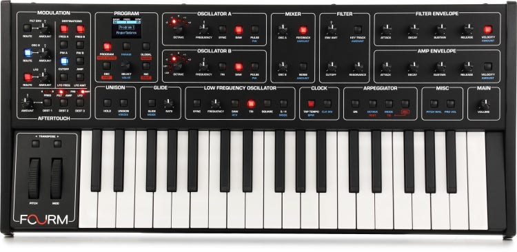 37-key Polyphonic Analog Synthesizer with 2 VCOs, Low-pass Filter, 2 ADSR Envelopes, Sequencer/Arpeggiator, Polyphonic Aftertouch, Modulation Matrix, and 128 Presets