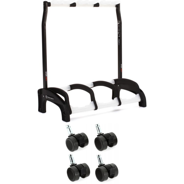 Collapsible 3-slot Guitar Stand for Acoustic, Electric, and Bass Guitars, with Integrated Pick Holders and (4) 1.5" Locking Casters