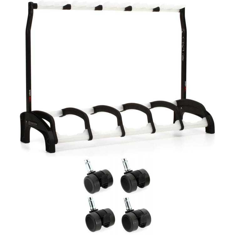 Collapsible 5-slot Guitar Stand for Acoustic, Electric, and Bass Guitars, with Integrated Pick Holders and (4) 1.5" Locking Casters