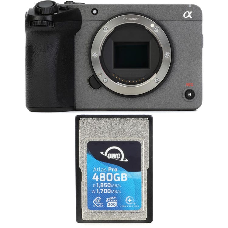 Mirrorless Camera Body with Super 35mm Format 20.1MP Exmor R APS-C CMOS Sensor, S-Cinetone, Autofocus, 4K HDR, 2 Card Slot, 3 x 1/4" Mounting Points, and 4.0 Type A Memory Card - 480GB