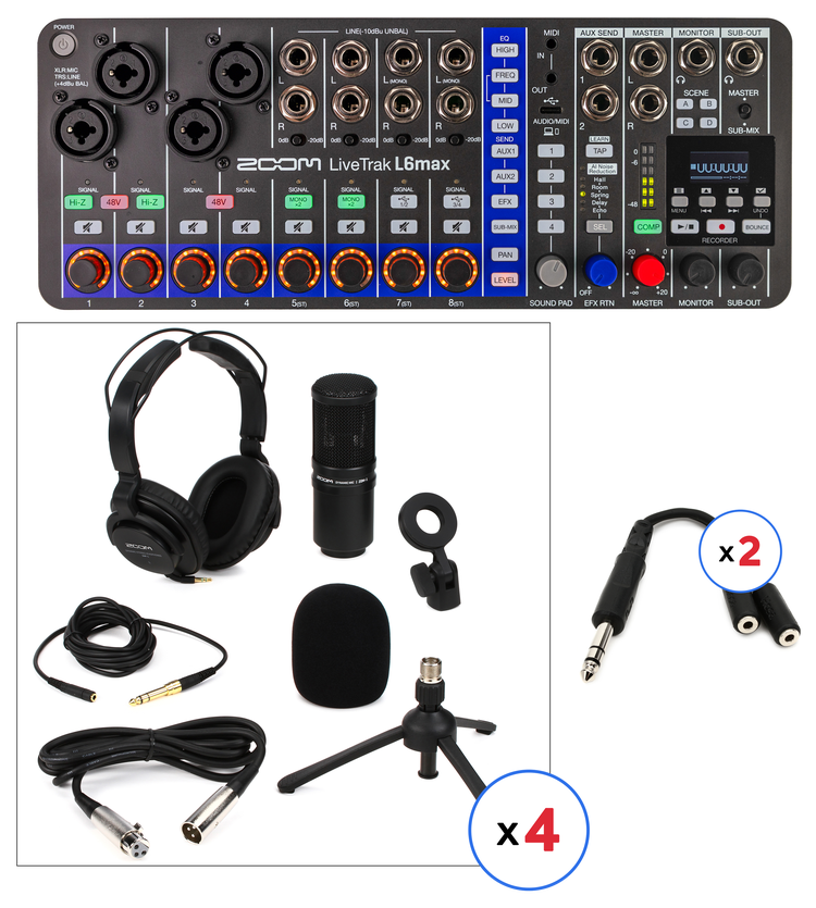 12-channel, Battery-powered Digital Mixer, 32-bit Float/48kHz, with 14-track Recording, 12-in/4-out USB Audio Interface, 4 Mic Preamps, DSP; and Studio Microphone Bundle with (4) ZDM-1 Large-diaphragm Dynamic Microphones, (4) ZHP-1 Closed-back Headphones, (4) ZTPS-4 Tabletop Tripods, (4) Microphone Cables, and (4) Windscreens; and (2) Hosa YMP-234 Y Cables
