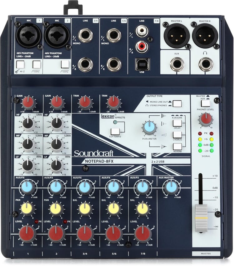 8-channel Analog Mixer with 2 Microphone Preamplifiers, Direct Input, Phantom Power, 3 Stereo Line-level Channels, Lexicon Digital Effects, and USB Connectivity