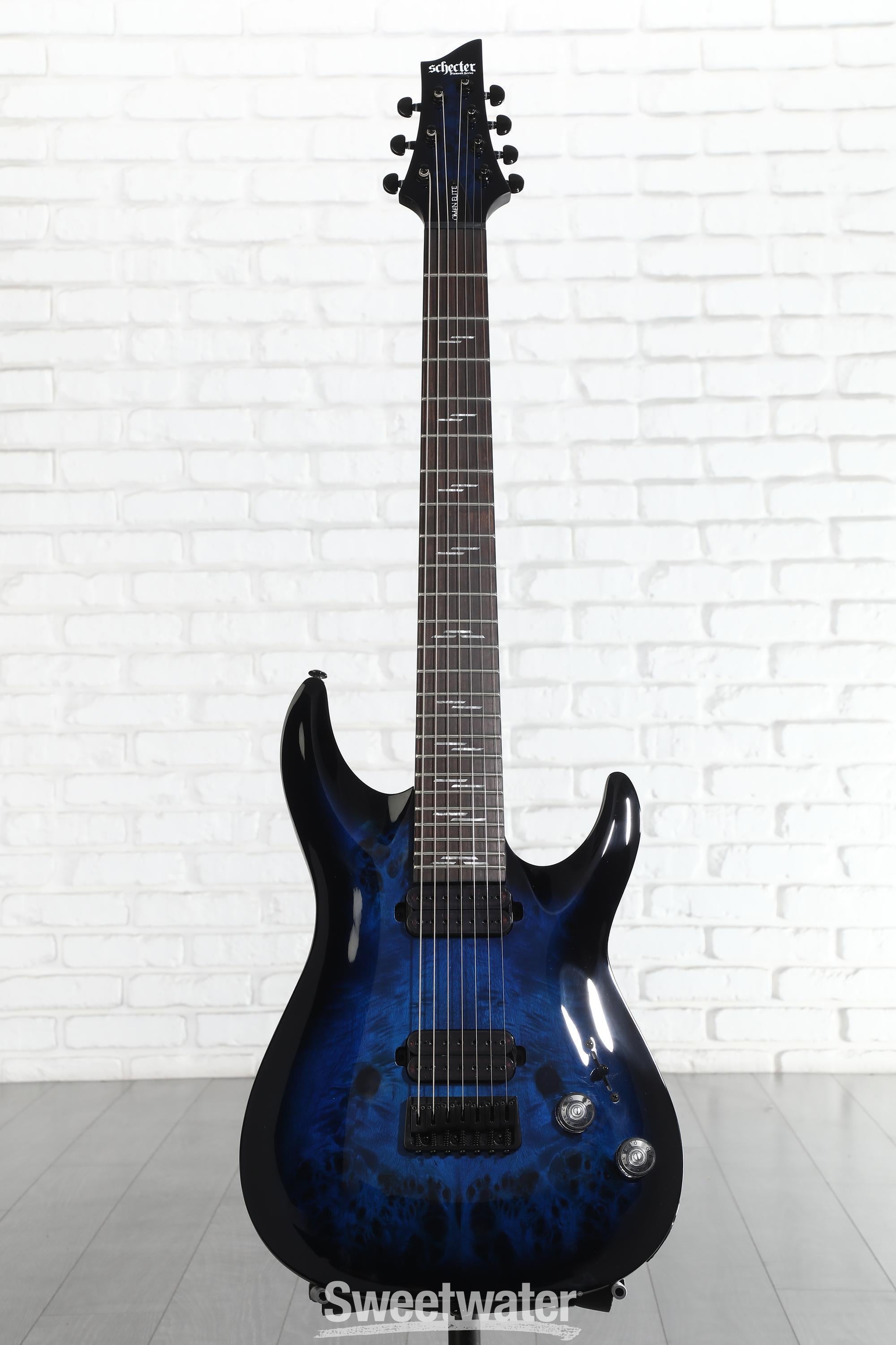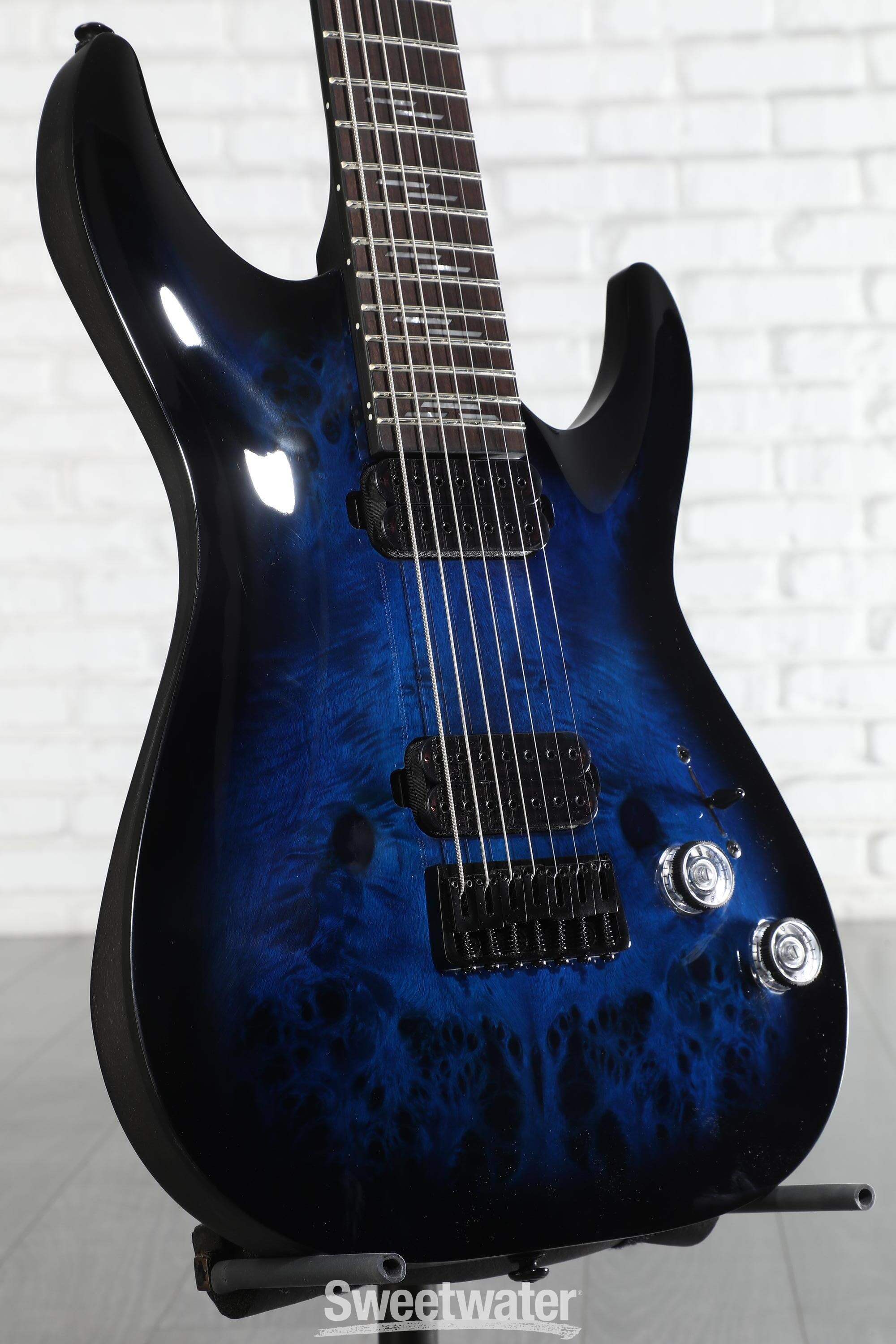 A few years back I decided my next guitar would be a 7 string. I'd never tried one before but knew for the metal I play it would be an easily justified reason to pick up my 8th guitar. I was originally eyeballing the Jackson Dinky for under $ to just get an idea if I'd like playing a 7. While researching, an ESP 7 string kept popping up in the results for around $ that got me thinking about expanding my price range to that just to see what's out there. Then the red Omen Elite 7 caught my eye. I did a lot of research on the model and really liked what I read and heard. But...I already own 2 red and 2 black guitars and wanted something different. The charcoal is awesome, but not really my style, so blue it would be. Then I saw this specific blue one I ended up buying on Sweetwater, with a lighter blue and a great stain pattern from the burl, and knew that not only was this the model, but THIS was my guitar. So I placed the order, paid the down payment, and my new guitar arrived the next day.