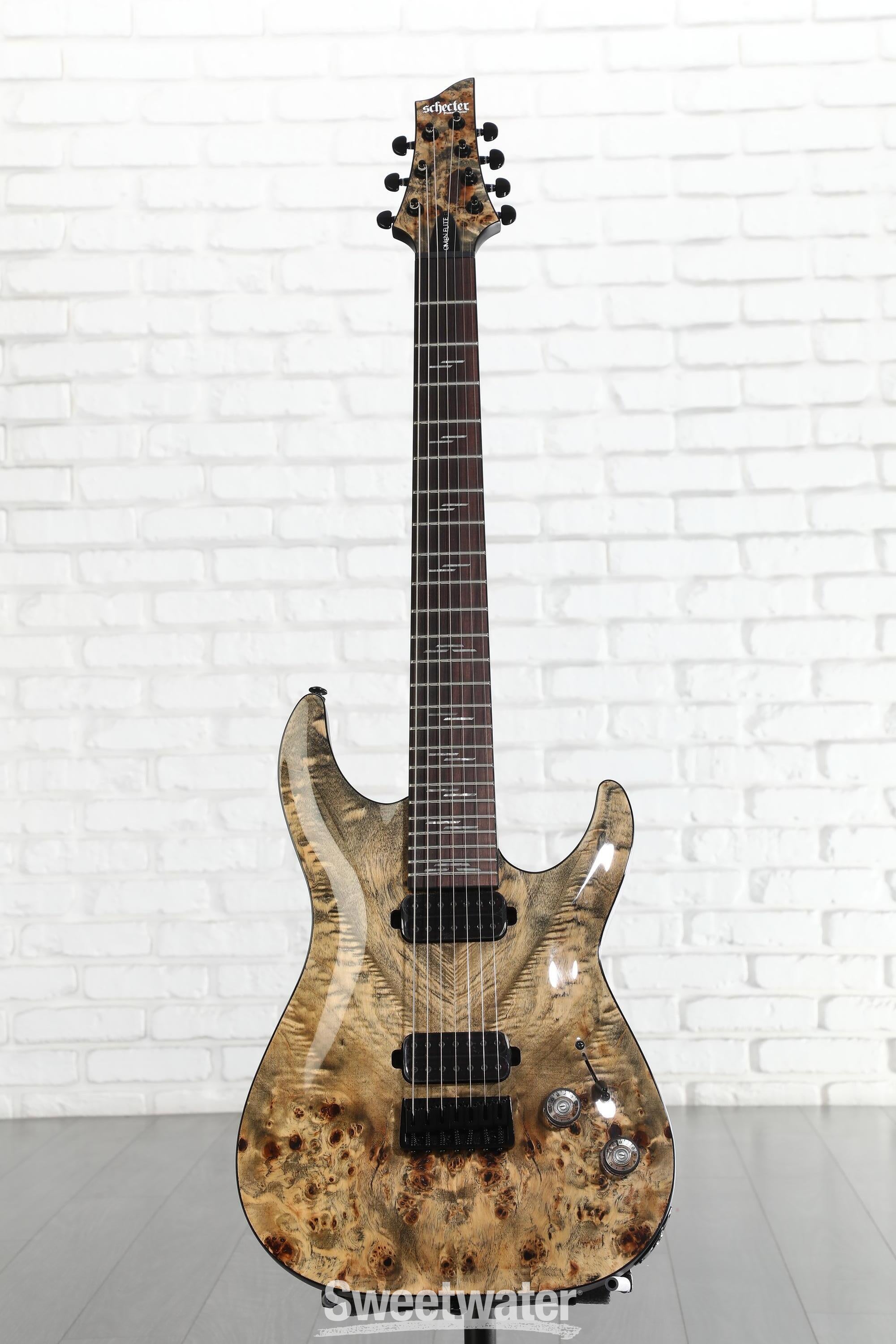 With its bewitching burl top and hair-raising Heretic pickups, the Schecter Omen Elite-7 is one seven-string you won't be able to keep your hands off for long. The Omen series has been a longstanding favorite to players and customers here at Sweetwater, and we feel the Omen Elite-7 marks a notable upgrade in all the right directions. Back are the substantial-feeling mahogany-maple construction and streamlined electronics. But factor in a slew of visual upgrades, a fast-as-ever Thin "C" neck, and mean-sounding set of hot-rodded Heretic pickups, and this Elite is one Omen that's too good to pass up.