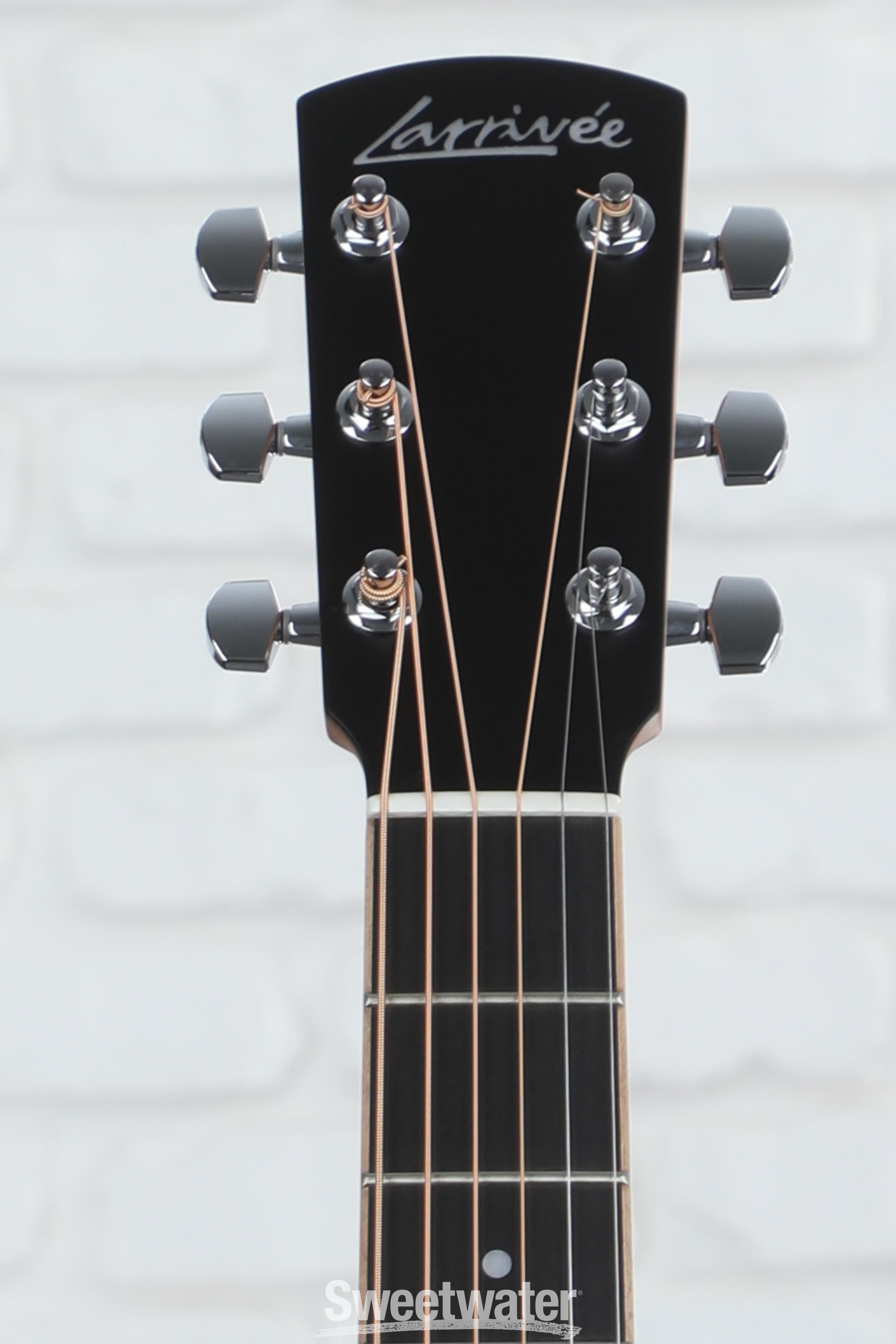 Larrivee’s parlor-sized models are a loving tribute to the earliest era of steel-string acoustic guitar building, long before anyone had ever heard of a dreadnought guitar! Parlor-sized models may not be your first choice for big, boomy strummed chords, but these petite guitars boast a clear, crisp, and projecting tone that’s ideal for fingerpickers, delicate strummers, and lead players alike. Plus, since the soundboard is smaller on a parlor guitar, it offers a significantly more responsive feel — this allows even the most delicate of notes to drive the top and bloom with a rich resonance.