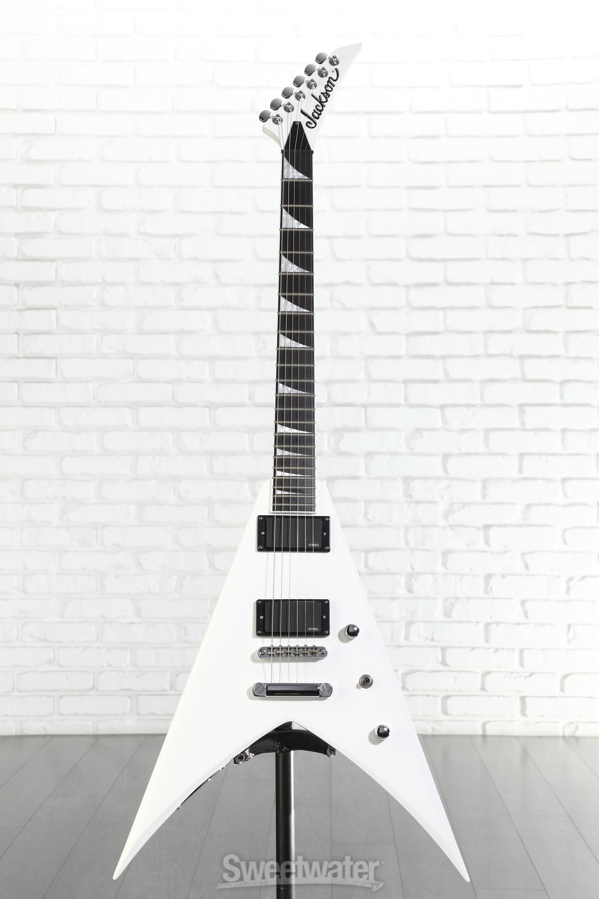 Jackson’s King V has been proudly wielded by legions of legendary guitarists, including Dave Mustaine, Phil Demmel, Corey Beaulieu, and Robbin Crosby (the late Ratt guitarist after whom it was named). The Pro Series King V KVTMG boasts a classic aggressive V-shaped body along with pro-level features that exceed expectations. This solidbody electric guitar was built for speed, boasting a slick-playing compound-radius ebony fingerboard with eye-grabbing pearloid shark fin inlays. Its graphite-reinforced through-body neck provides incredible sustain and stability, ably bolstered by a TOM-style adjustable bridge and anchored tailpiece. The King V KVTMG delivers enough output to flatten the first 10 rows, thanks to its active EMG humbuckers, along with incredible high-end cut, fluid sustain, and laser-precise articulation. When you’re ready to get down to business, the Jackson Pro Series King V KVTMG guarantees that business will always be good.