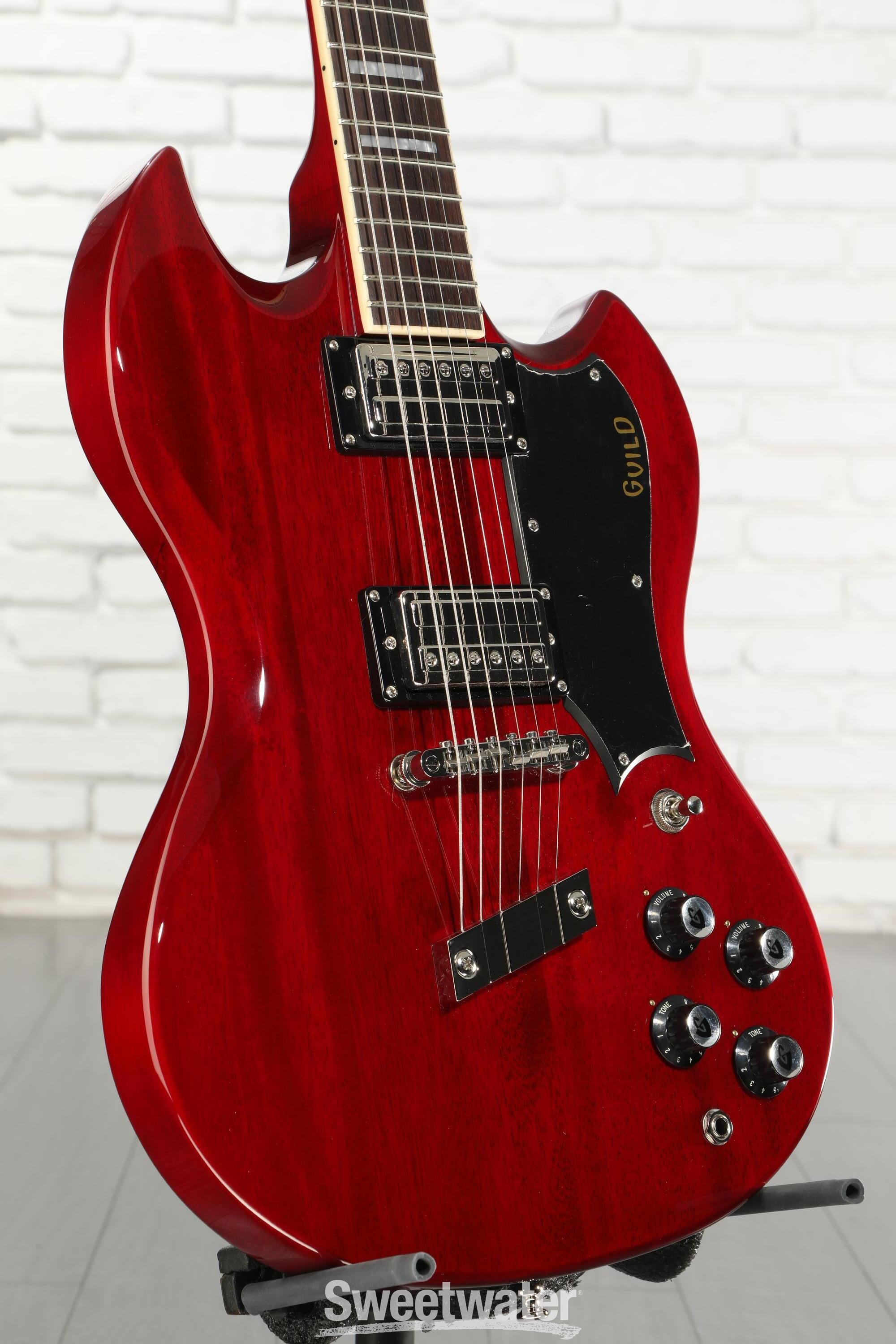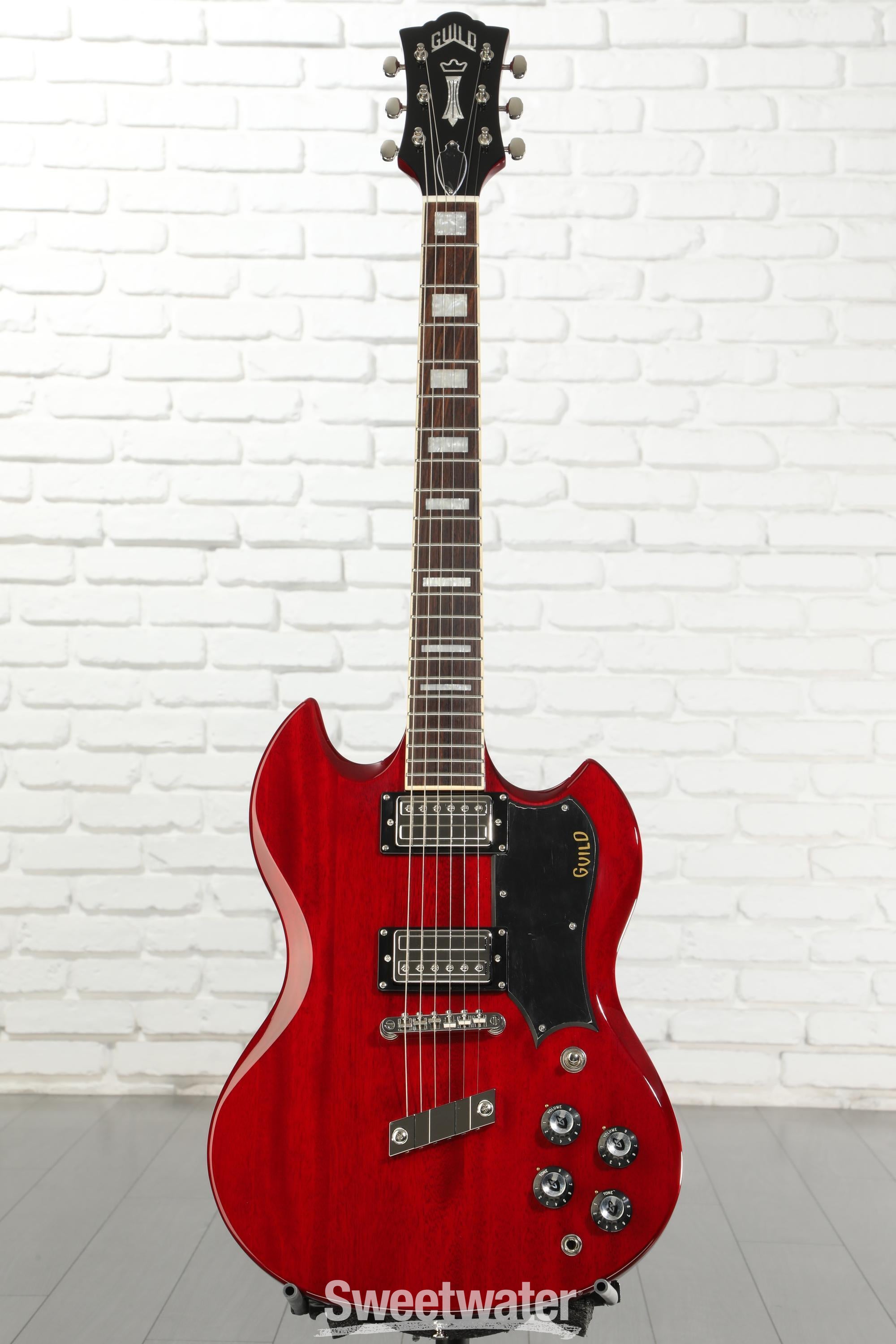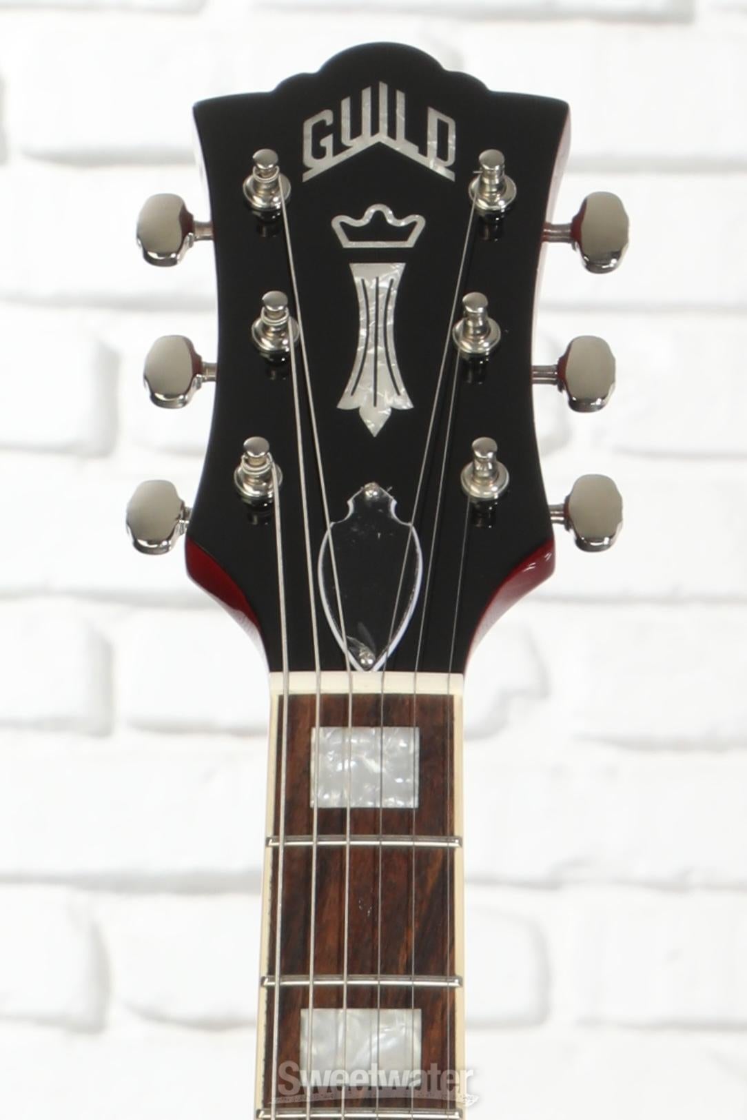 - Deluxe appointments include pearloid headstock inlay and block fingerboard inlays, ivory fingerboard binding, gleaming nickel pickup covers, Guild top hat knobs, and stage-ready polyurethane finish