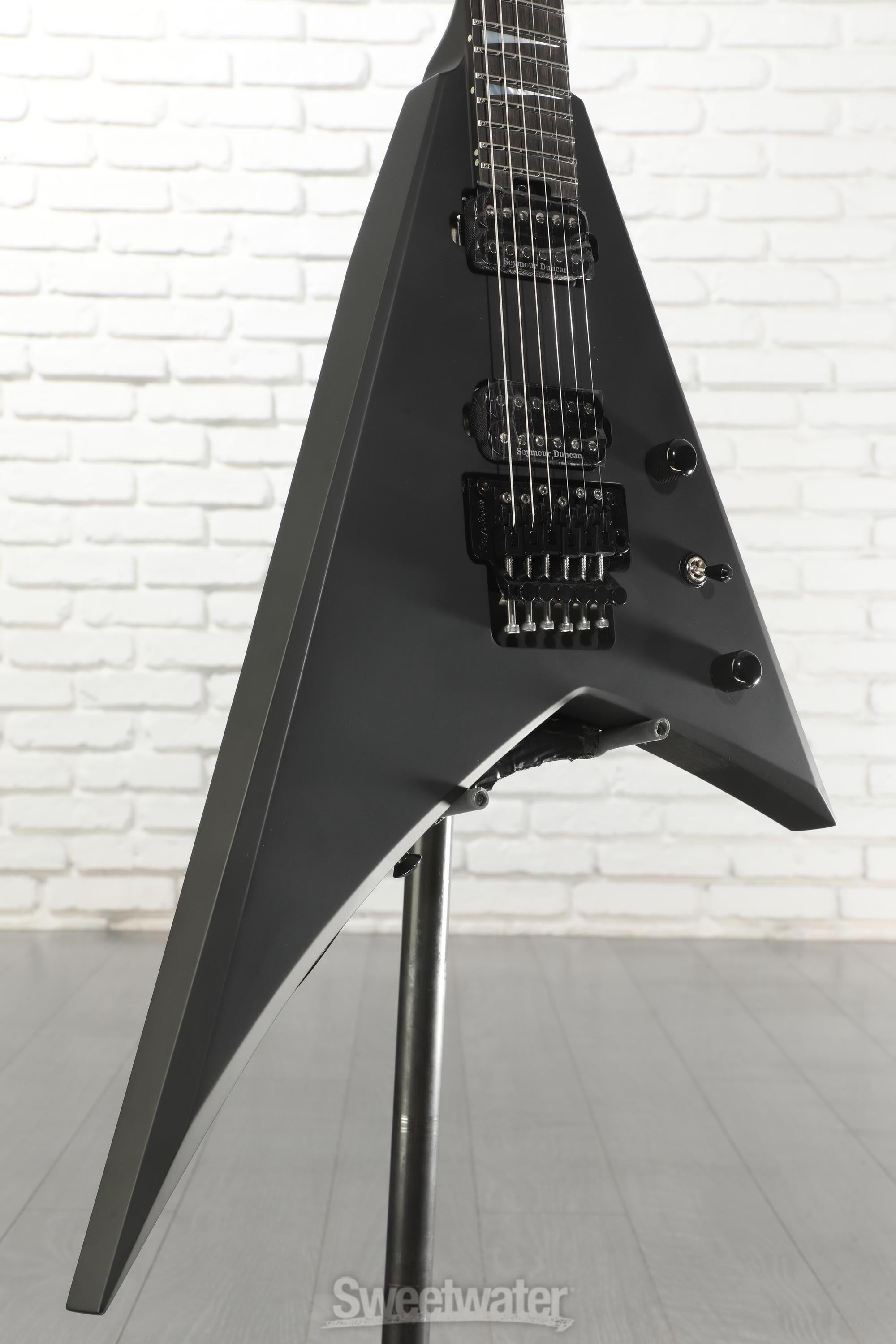 A contemporary update of the early-’80s Randy Rhoads model, the Jackson American Series Rhoads RR24 offers the modern player a razor-sharp blend of heritage and innovation. This sleek, aggressively styled solidbody electric guitar boasts an asymmetrical, offset-V-shaped alder body, which is reinforced by robust neck-through construction, ensuring rock-solid stability and natural, singing sustain in endless supply. The RR24 features a 3-piece maple Speed Neck, which is capped with a lightning-fast compound-radius ebony fingerboard and crowned with 24 jumbo-size stainless steel frets. Matched with a high-gain amplifier pushed to its limits, this axe’s direct-mount Seymour Duncan humbuckers unleash tones that rip through fusion, blaze through hard rock, and annihilate in full-throttle metal. You also get resilient Gotoh tuning machines and a Floyd Rose 1500 double-locking tremolo, enabling you to engage in wanton whammy abuse with absolute impunity. Inverse mother-of-pearl sharkfin fingerboard inlays, Luminlay side dots, a reverse headstock, and a spotlight-ready satin finish put the perfect final touches on this exquisite instrument. Crafted where it all started — in Corona, California — the American Series Rhoads RR24 was forged for fearless shredders who dare to chase the same electrifying legacy Randy carved into rock history.