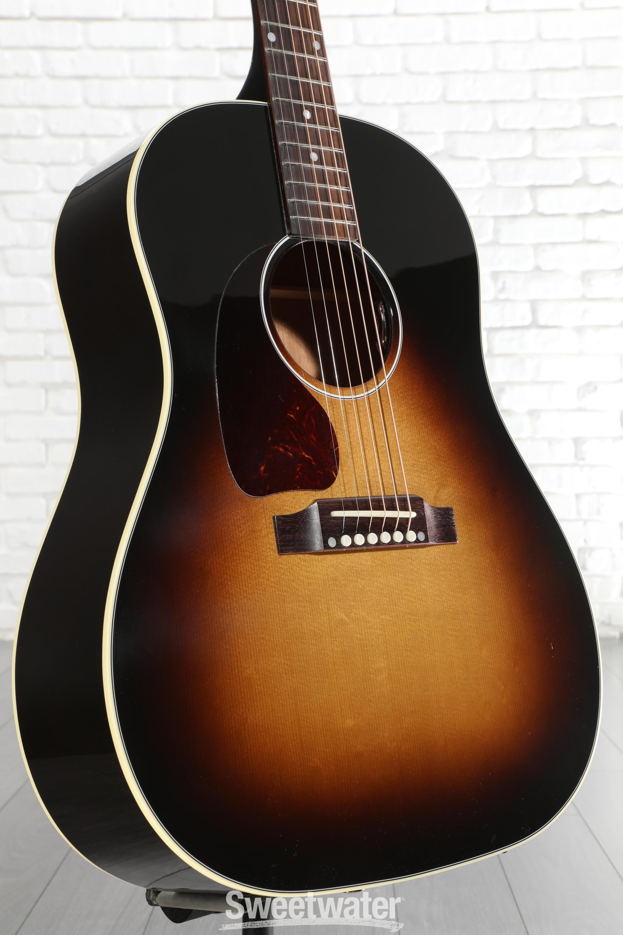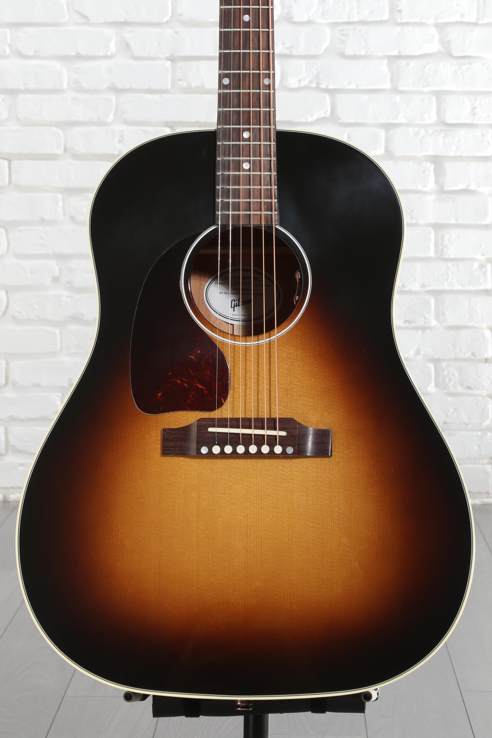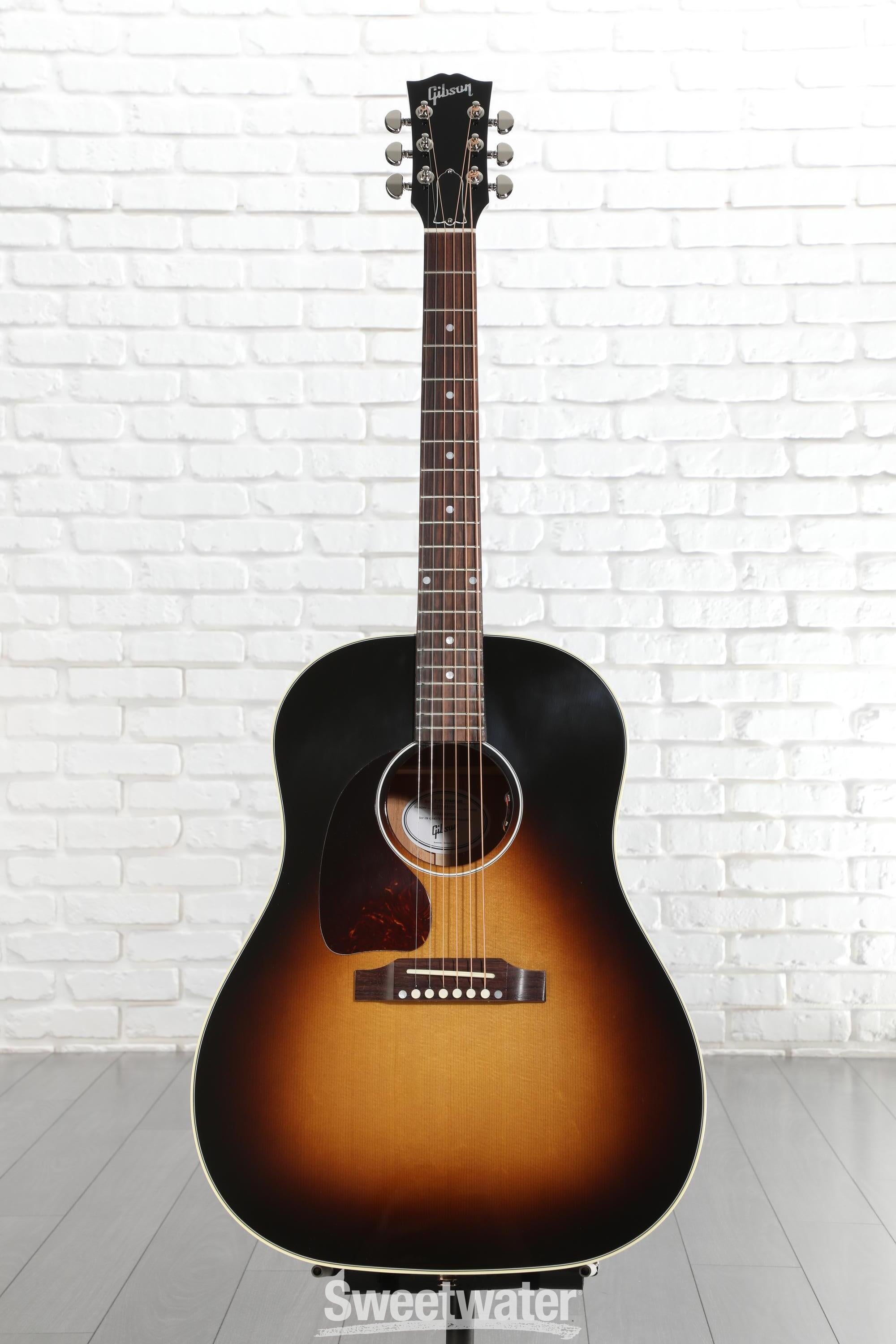 A veritable icon of American craftsmanship, the Gibson Acoustic J-45 Standard’s storied legacy traces back to 1942 and its ensuing status as “the workhorse” of acoustic guitar designs. Originally named after its modest $45 price tag and “jumbo” body, the J-45 has inspired generations of guitarists and fueled the sounds of countless classic recordings — if you’re even tangentially familiar with the classic rock, pop, and country music of the 20th century, you’re already well-acquainted with the J-45’s inimitable drawl. This slope-shouldered dreadnought guitar’s Sitka spruce top, hand-scalloped X-bracing, and mahogany back and sides deliver a midrange-minded projection, deep bass, and crisp decay, supplying what many guitarists consider to be the defining sound of a steel-string acoustic guitar. On the opposite end, the J-45 Standard modernizes its historic formula with an easy-playing mahogany neck in Gibson’s SlimTaper profile, topped with a sleek 12-inch-radius rosewood fingerboard. What’s more, this J-45 is ready to take on any stage, anywhere, thanks to its onboard LR Baggs VTC electronics. Lastly, the Gibson J-45 Standard comes crowned with Grover Rotomatic tuning machines and draped in a nitrocellulose lacquer finish that will gracefully age the more you play. When you pick up a Gibson J-45 Standard, you’re not just playing any acoustic guitar; you’re playing a true piece of American musical history.
