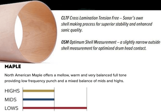 Sonor's strength-enhancing Cross Lamination Tension Free (CLTF) shell construction and Optimum Shell Measurement (OSM) shell undersizing create a drum that is sonically and structurally superior to others in its class.