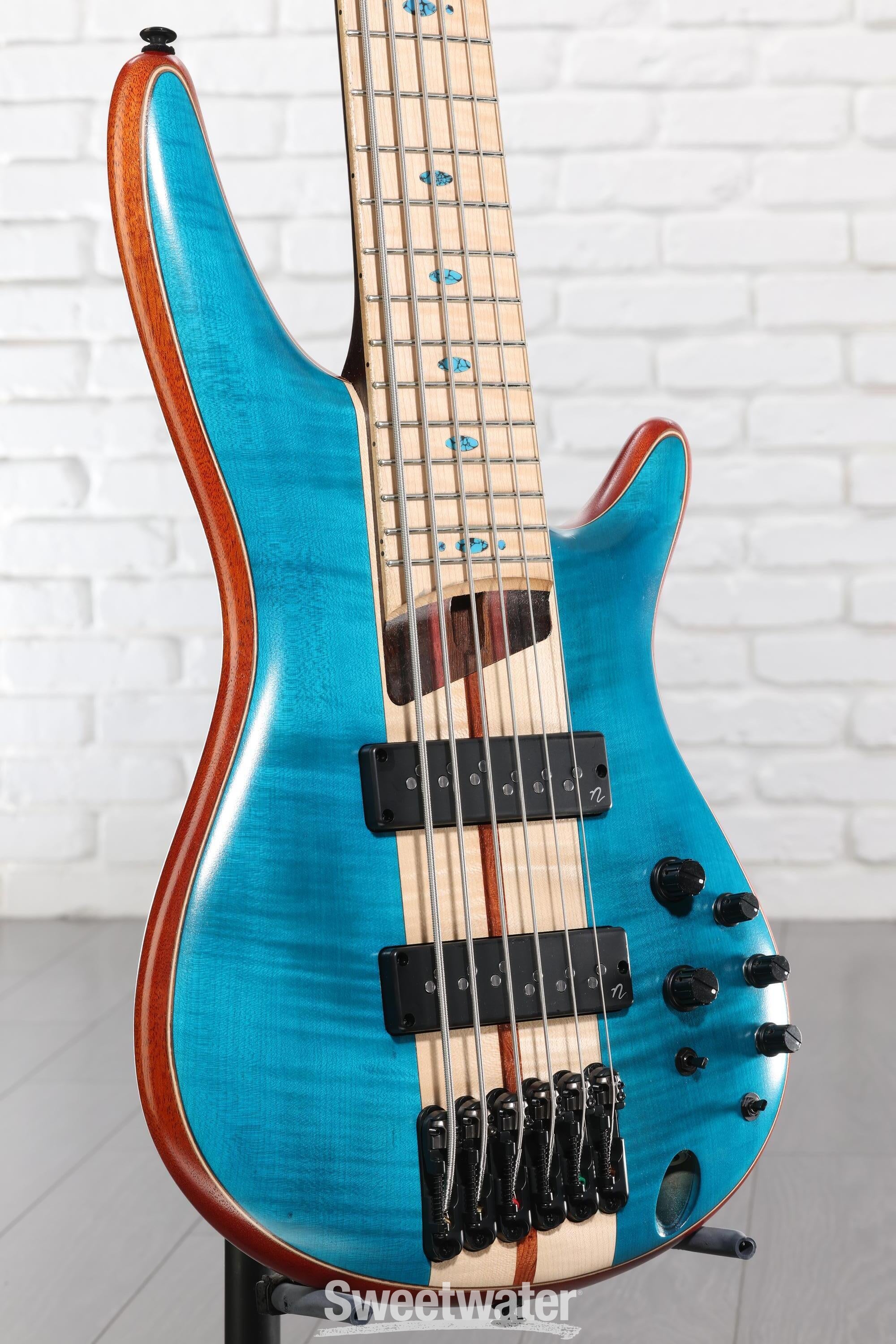 At Sweetwater, we're fortunate to get our hands on some of the finest instruments available today, and we can confidently say that the Ibanez SR Premium 6-string electric bass guitar punches above its price range in every way. Sporting a sleekly contoured African mahogany body, a gorgeous flamed maple top, a rock-solid 5-piece panga panga/purpleheart bolt-on neck, and a flamed maple fingerboard, the SR Premium 6-string is a boutique-quality instrument with impeccable playability. That quality is borne out of its pair of aggressive Nordstrand Big Break pickups, which deliver massive, roaring tone infused with monumental sustain. The 5-piece neck is titanium reinforced with KTS titanium rods, with premium tuners on one end and a Mono-rail bridge at the other. Ibanez's Custom Electronics 3-band EQ completes the setup.