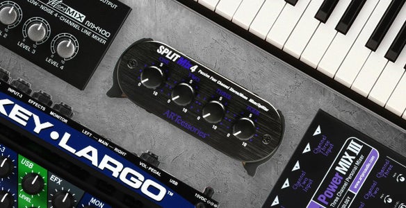 The SPLITMix4 is a 4-channel passive mixer that's equipped with four stereo input channels and one stereo output, all on 1/4" connectors. You can mix four stereo input channels down to one stereo output, split a stereo input channel to four stereo output channels, or combine these configurations to meet nearly any need. The SPLITMix4's independent stereo level controls provide over 90dB of attenuation per channel. Designed primarily as a line-level mixer for medium input/output impedances, the SPLITMix4 features a compact desktop-ready format.