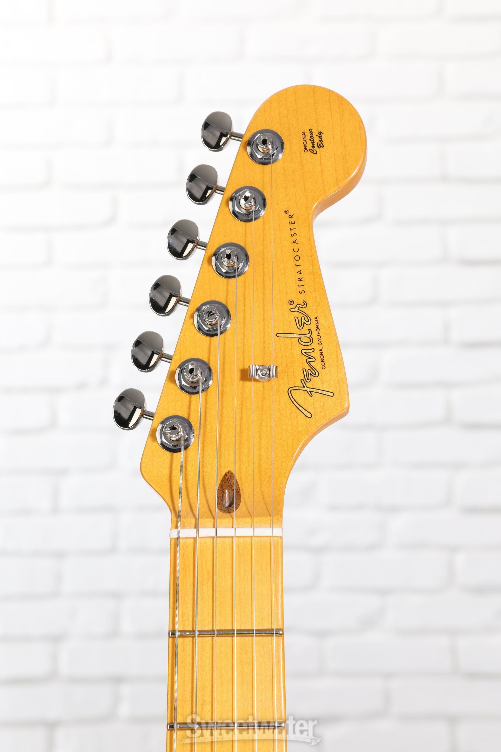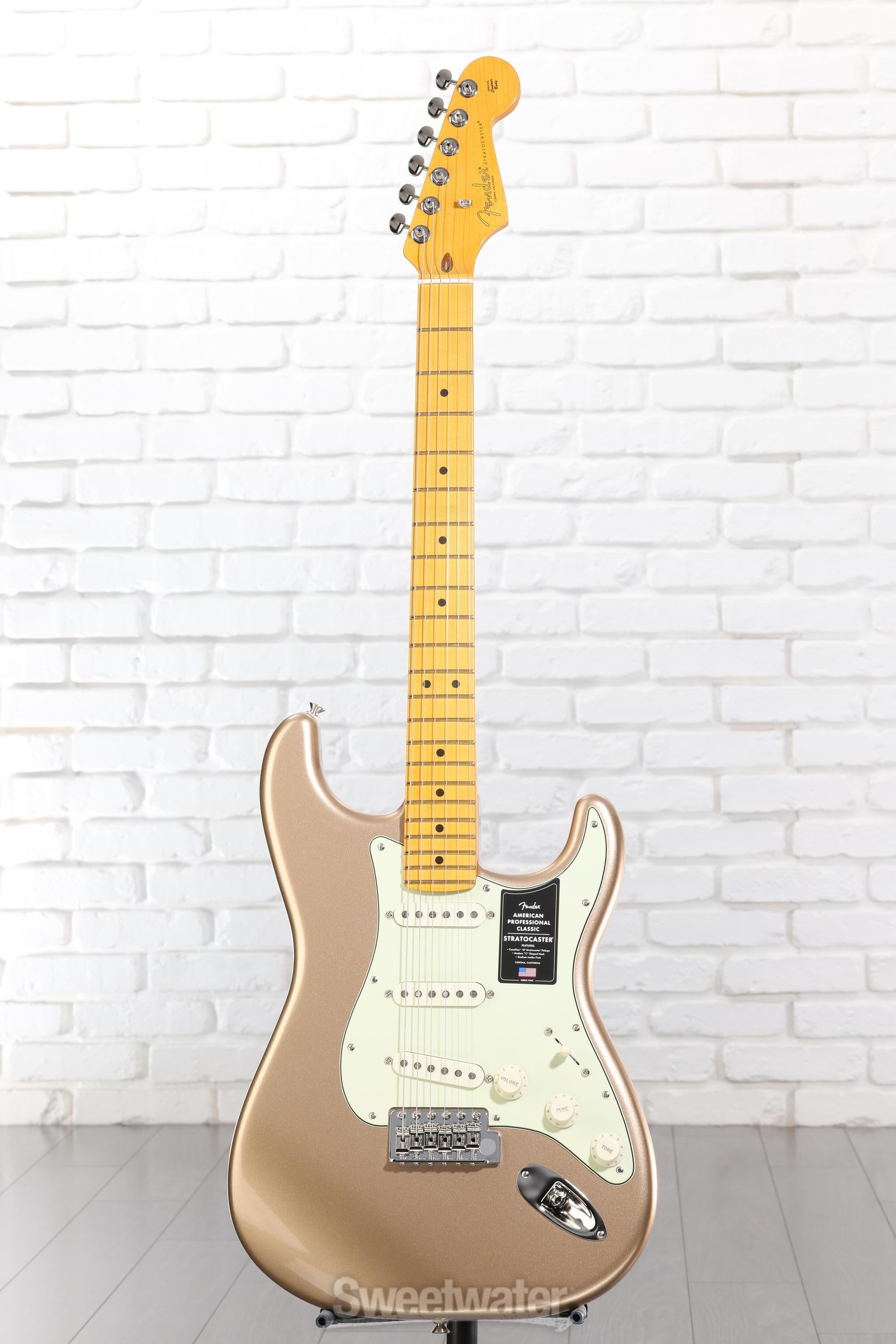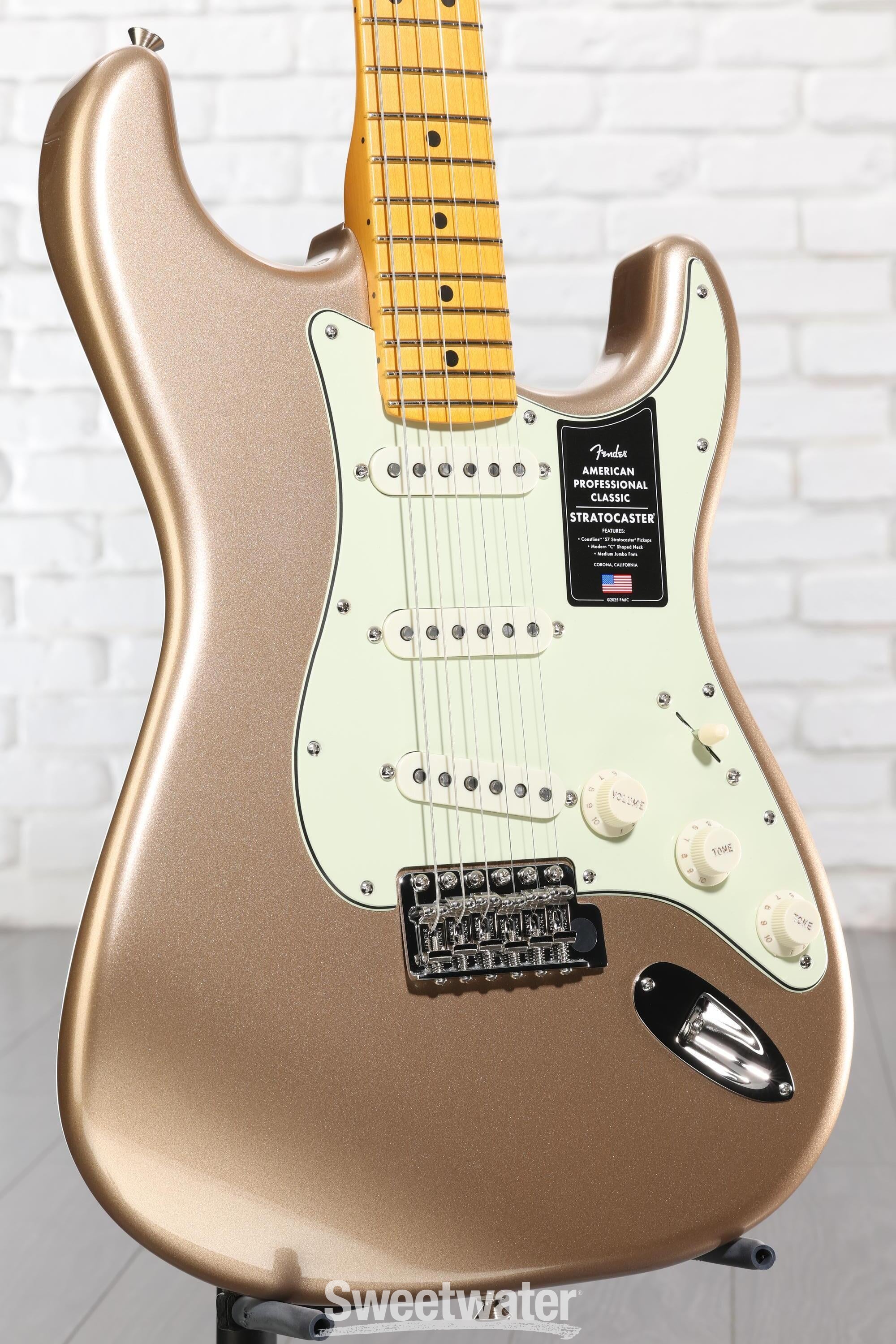 A delightful fusion of vintage charm and modern execution, the Fender American Professional Classic Stratocaster offers a premium Strat playing experience with tone to match. Its solid alder body flaunts familiar Strat contours, imbuing it with the soul of a golden-era Fender, evolved for today's players. The satin-finished maple neck, which sports a Modern C shape, gives this solidbody electric guitar an eminently satisfying, hand-filling feel. Meanwhile, the 9.5-inch-radius, 22-fret fingerboard provides you with a revved-up platform for lightning-fast playability. No matter what you plug the American Professional Classic Strat into, you'll revel in the depth, punch, and sparkle of its overwound, vintage-inspired Coastline '57 Stratocaster pickups, which are bolstered by Fender's Greasebucket Tone Circuit. You also get Fender Staggered ClassicGear tuning machines and a vintage-style synchronized tremolo, certifying rock-solid stability — even under demanding playing conditions. Finally, a custom-faded finish, a 3-ply pickguard, and aged plastic parts give this Strat a spotlight-stealing look that's impossible to ignore. Are you searching for a pro-grade instrument with vintage aesthetics and modern performance? If so — take it from Sweetwater — the American Professional Classic Stratocaster is calling your name.