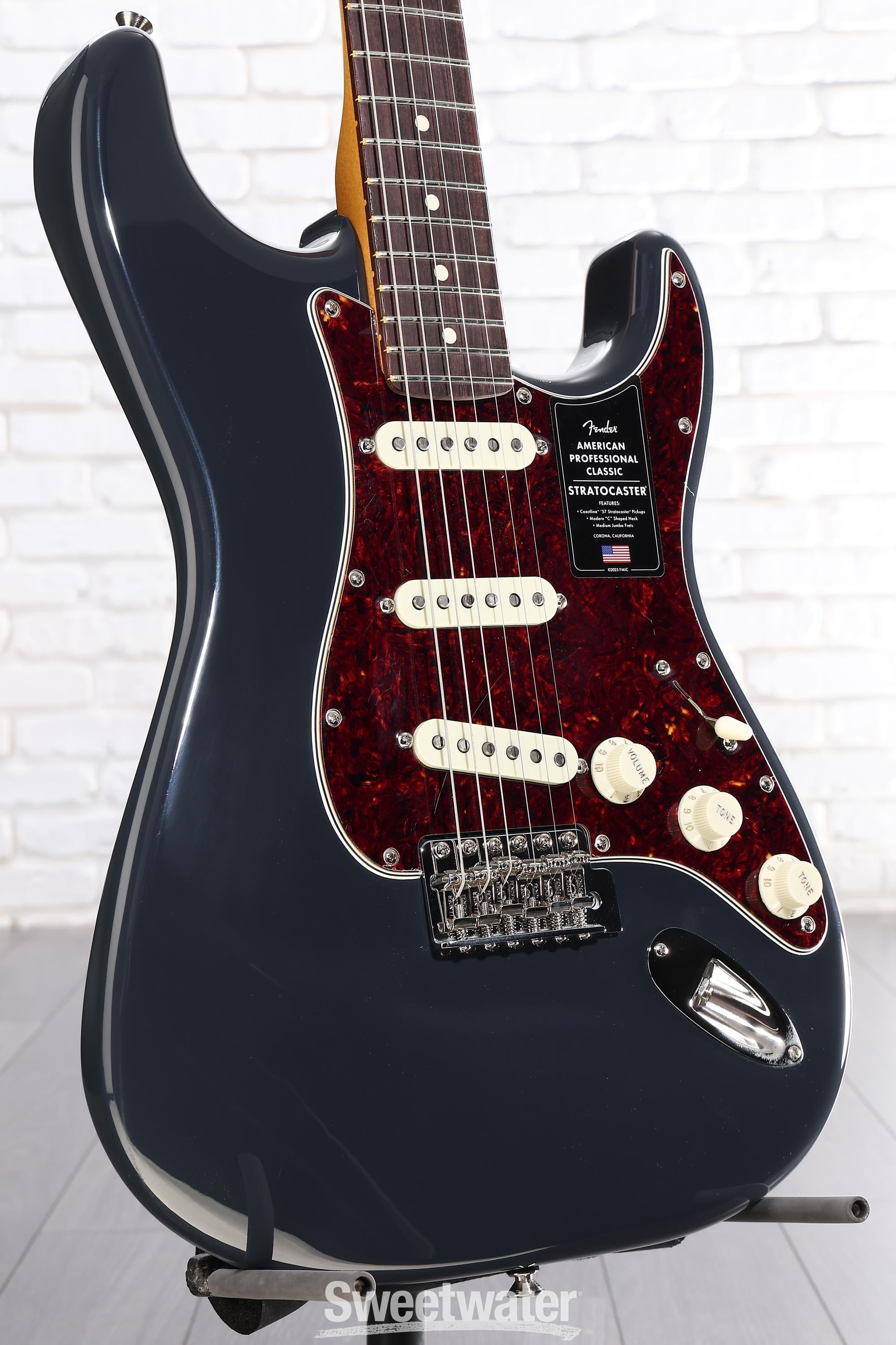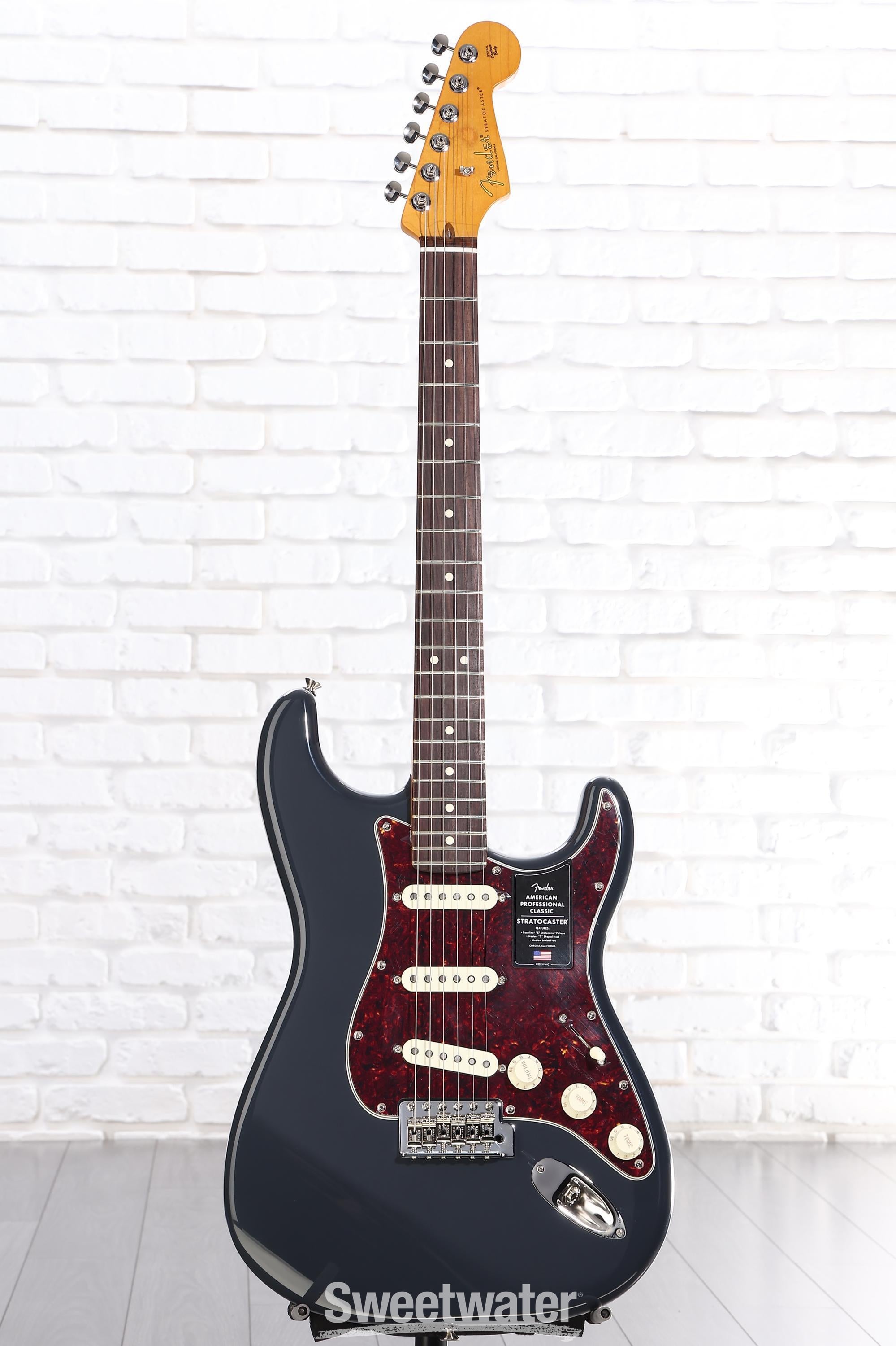 A delightful fusion of vintage charm and modern execution, the Fender American Professional Classic Stratocaster offers a premium Strat playing experience with tone to match. Its solid alder body flaunts familiar Strat contours, imbuing it with the soul of a golden-era Fender, evolved for today's players. The satin-finished maple neck, which sports a Modern C shape, gives this solidbody electric guitar an eminently satisfying, hand-filling feel. Meanwhile, the 9.5-inch-radius, 22-fret fingerboard provides you with a revved-up platform for lightning-fast playability. No matter what you plug the American Professional Classic Strat into, you'll revel in the depth, punch, and sparkle of its overwound, vintage-inspired Coastline '57 Stratocaster pickups, which are bolstered by Fender's Greasebucket Tone Circuit. You also get Fender Staggered ClassicGear tuning machines and a vintage-style synchronized tremolo, certifying rock-solid stability — even under demanding playing conditions. Finally, a custom-faded finish, a 4-ply tortoiseshell pickguard, and aged plastic parts give this Strat a spotlight-stealing look that's impossible to ignore. Are you searching for a pro-grade instrument with vintage aesthetics and modern performance? If so — take it from Sweetwater — the American Professional Classic Stratocaster is calling your name.