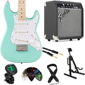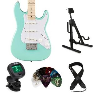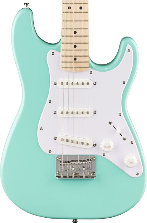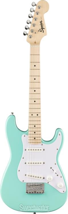 The Squier Mini Strat makes an excellent electric guitar for beginners, youngsters, and travelers. This 3/4-size instrument might be unassuming in size, but it's a certified tone monster when you plug it in. This 6-string calls upon three single-coil pickups designed in the spirit of its legendary double-cut ancestor, complete with a MasterVolume and Master Tone controls, plus a 5-way pickup selector to help you hone in on your sound. It's an absolute breeze to command as well, courtesy of a comfortable maple neck and fingerboard combo, shaped with a Classic-C profile for efficient playability each time you pick it up. To boot, its chrome-finished sealed die-cast tuning machines and hardtail bridge ensure reliable tuning. Perfect for smaller hands and sized just right for taking on the road, the Squier Mini Strat is the compact champion you've been searching for!