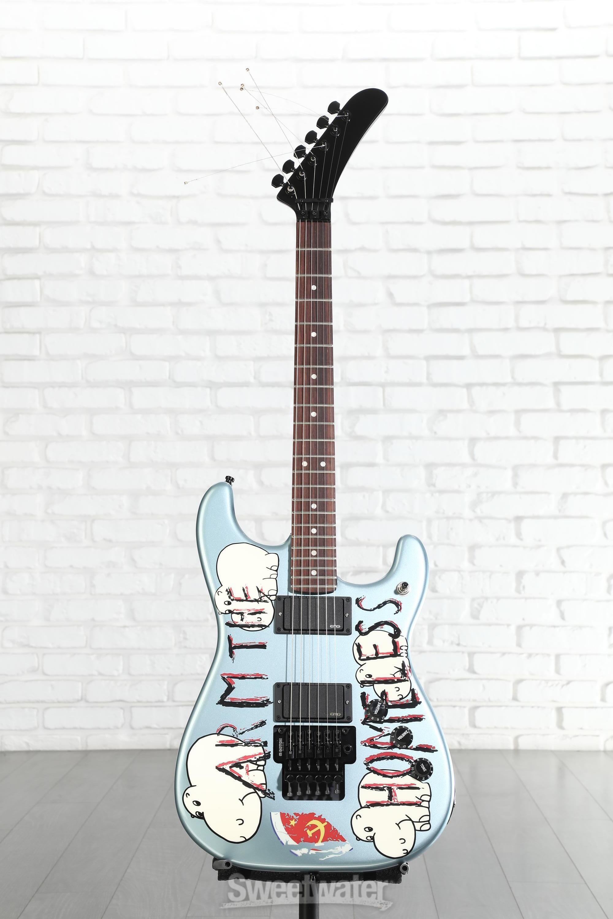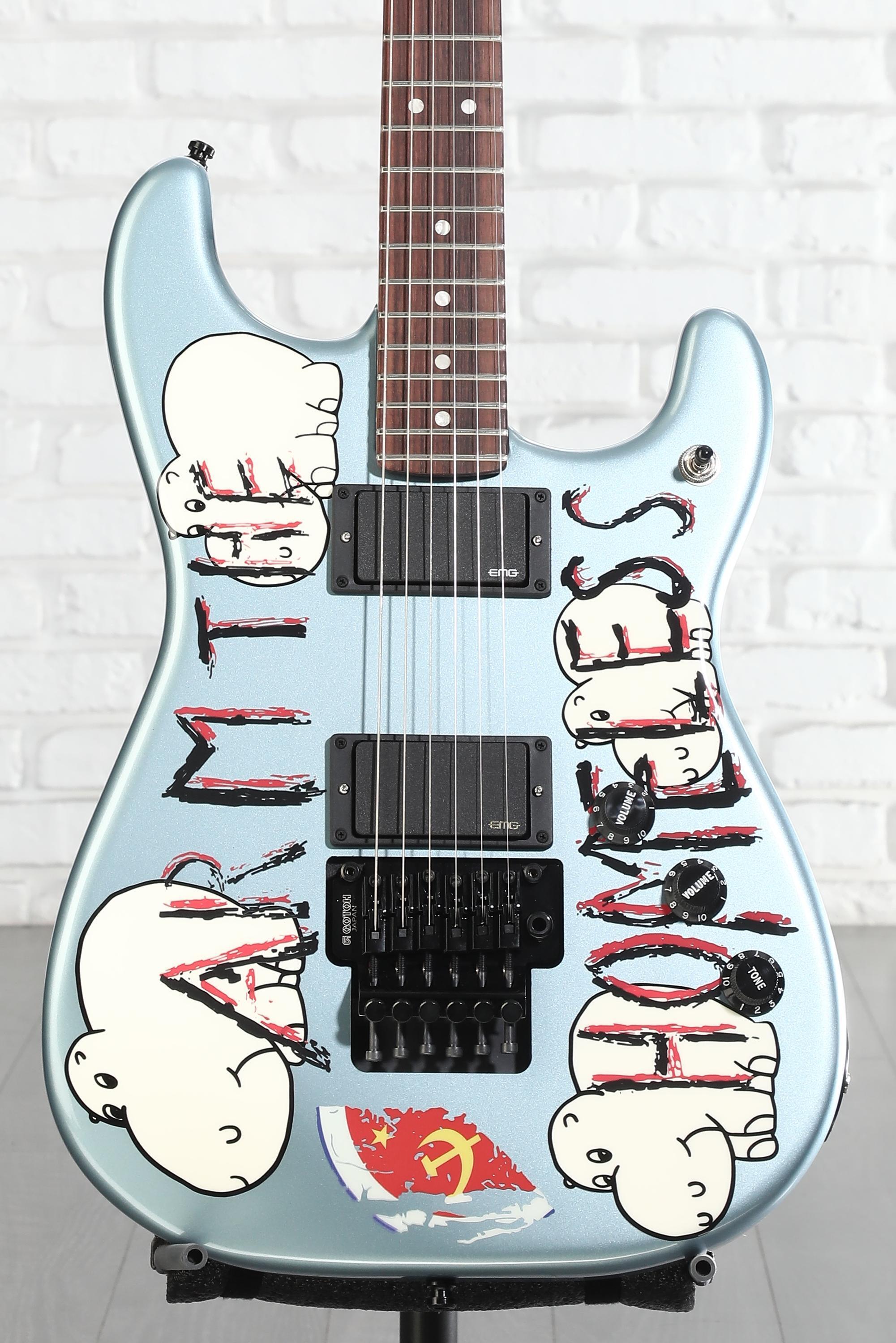Fueling his groundbreaking work in Rage Against the Machine, Tom Morello’s hippo-adorned, politically charged custom 6-string has stood as his most iconic guitar for more than three decades. Now, the renegade style and era-defying sound of that iconic instrument can be yours with the Fender Tom Morello “Arm The Homeless” guitar. Tom originally acquired the guitar in the late 1980s, and he quickly set about modding and replacing just about every component on the guitar — a fact reflected in Fender’s re-creation with its scattershot specs, including a double-cut alder body and a painted maple neck wielding a Custom Flat C profile and an angular “hockey stick” headstock. Under the hood, you get an EMG 85 in the bridge with an EMG H in the neck to capture the exact sound of Tom’s legendary playing, whether you’re dishing out classic early-era Rage riffs, scratching a hex key across the strings, or lighting up the stage with Whammy-induced madness. Moreover, an expressive double-locking Gotoh tremolo with a Floyd Rose locking nut ensures rock-solid stability while you traverse the 15-inch rosewood fingerboard’s 22 jumbo frets. Lastly (and most importantly), this guitar’s juxtaposition of political rebellion and happy hippos set upon a serene Ice Blue Metallic canvas mirrors the same hand-drawn artwork of Tom’s original guitar.