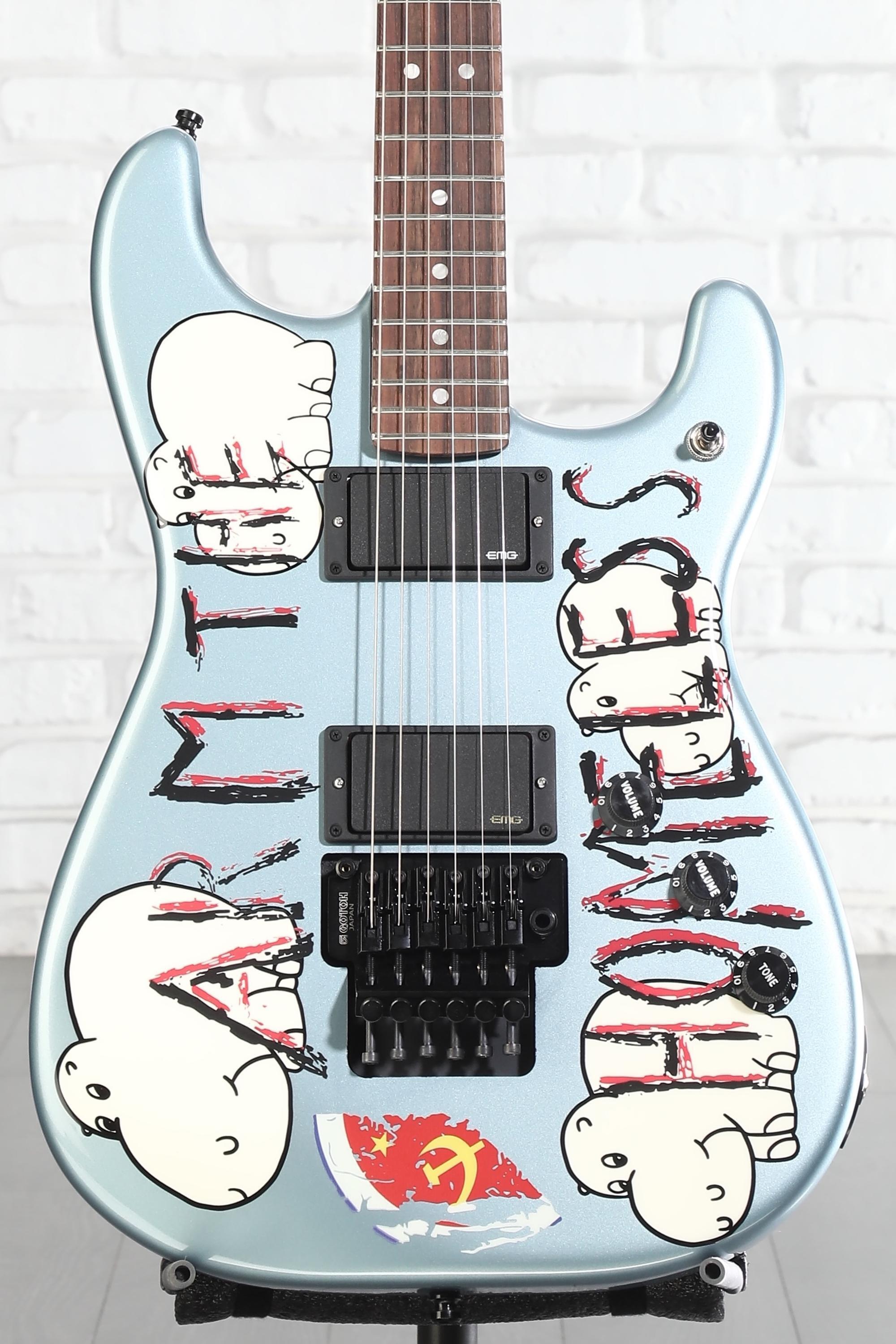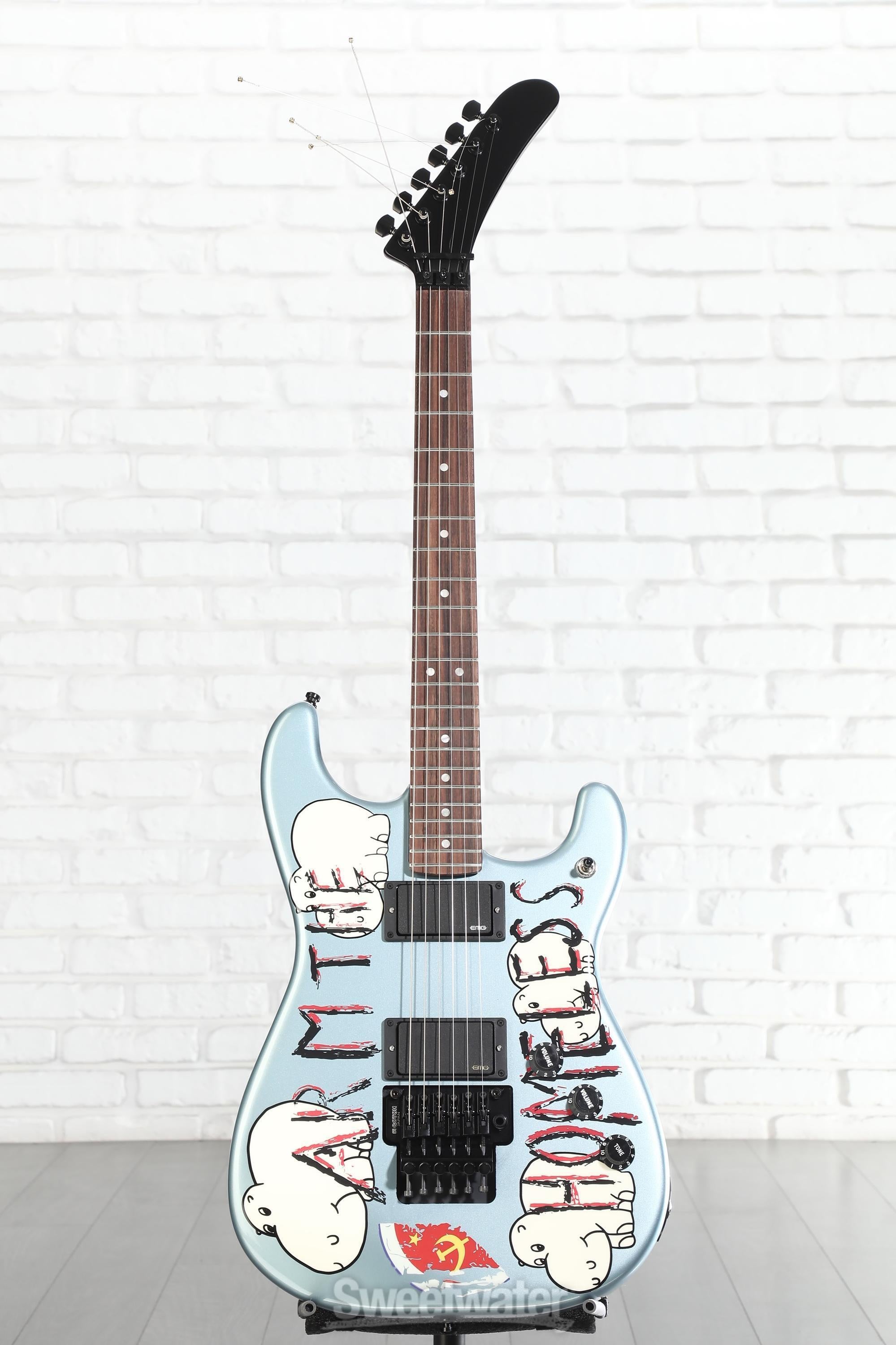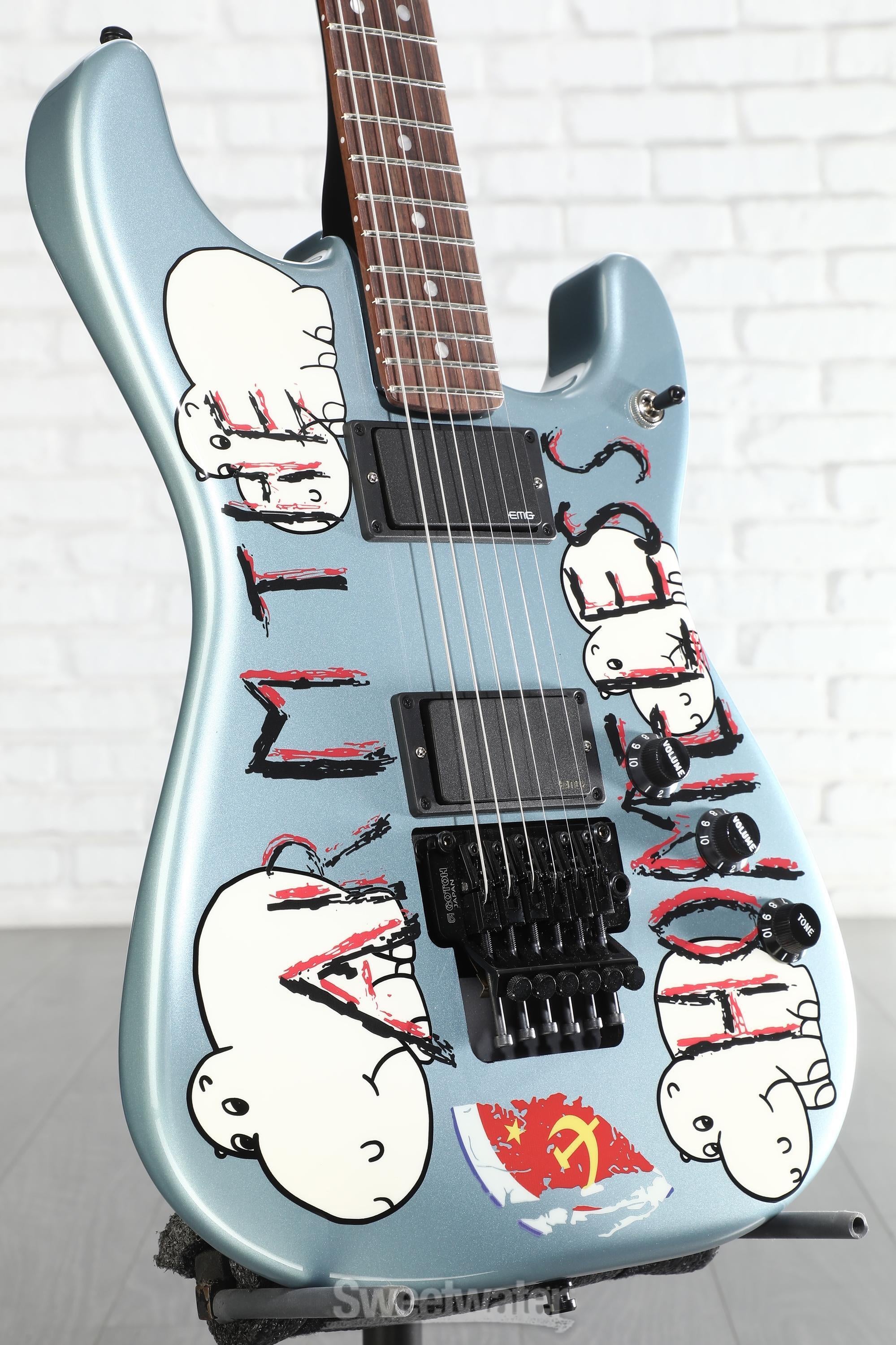 Fueling his groundbreaking work in Rage Against the Machine, Tom Morello’s hippo-adorned, politically charged custom 6-string has stood as his most iconic guitar for more than three decades. Now, the renegade style and era-defying sound of that iconic instrument can be yours with the Fender Tom Morello “Arm The Homeless” guitar. Tom originally acquired the guitar in the late 1980s, and he quickly set about modding and replacing just about every component on the guitar — a fact reflected in Fender’s re-creation with its scattershot specs, including a double-cut alder body and a painted maple neck wielding a Custom Flat C profile and an angular “hockey stick” headstock. Under the hood, you get an EMG 85 in the bridge with an EMG H in the neck to capture the exact sound of Tom’s legendary playing, whether you’re dishing out classic early-era Rage riffs, scratching a hex key across the strings, or lighting up the stage with Whammy-induced madness. Moreover, an expressive double-locking Gotoh tremolo with a Floyd Rose locking nut ensures rock-solid stability while you traverse the 15-inch rosewood fingerboard’s 22 jumbo frets. Lastly (and most importantly), this guitar’s juxtaposition of political rebellion and happy hippos set upon a serene Ice Blue Metallic canvas mirrors the same hand-drawn artwork of Tom’s original guitar.