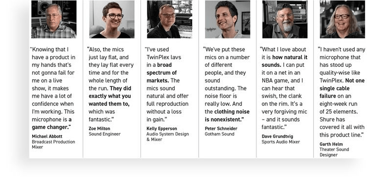Lab-tested, road-ready Shure TwinPlex lavalier microphones keep ticking when all others fail. Every microphone and cable in this series is treated to a series of exhaustive stress tests to ensure dependability and premium sound in real-world performance applications.
