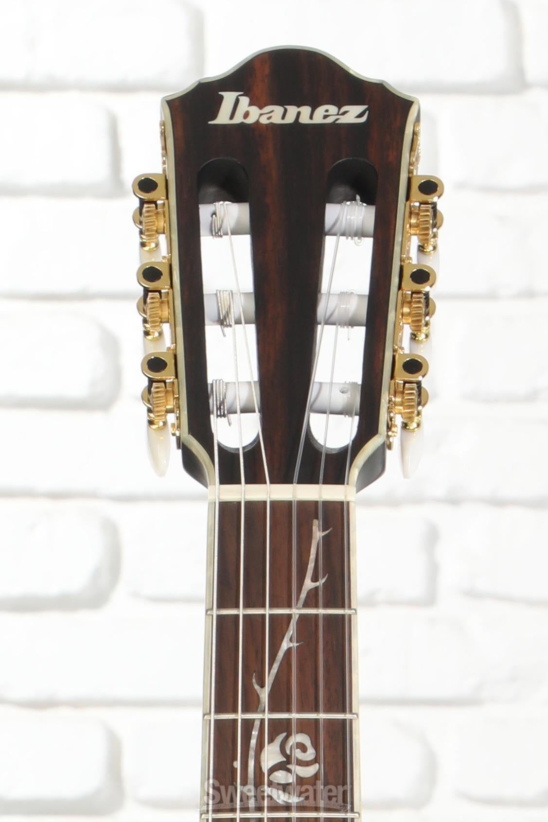• Ibanez AEQ210TF preamp and Fishman Sonicore pickup provide a rich, snappy nylon-string tone when plugged in