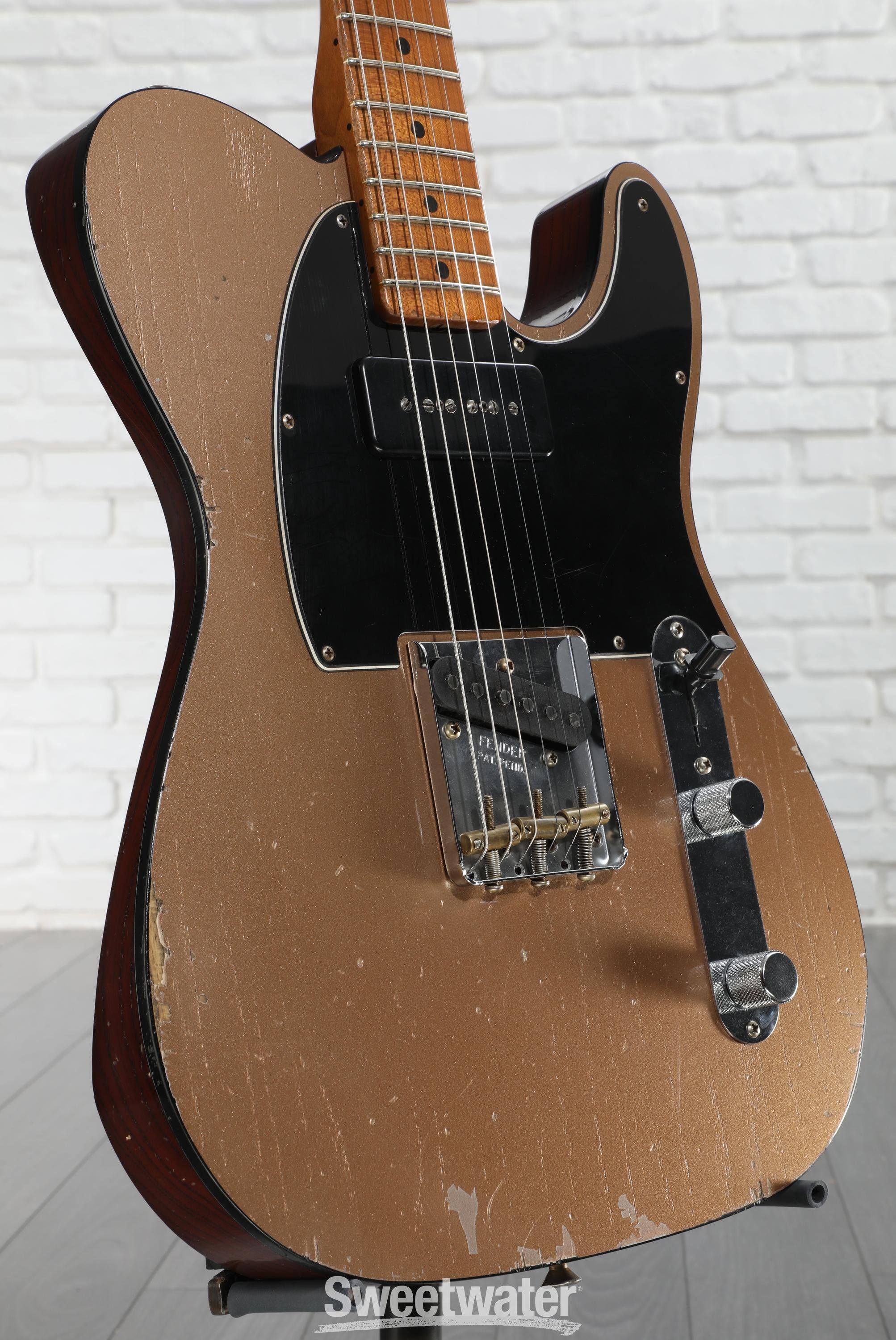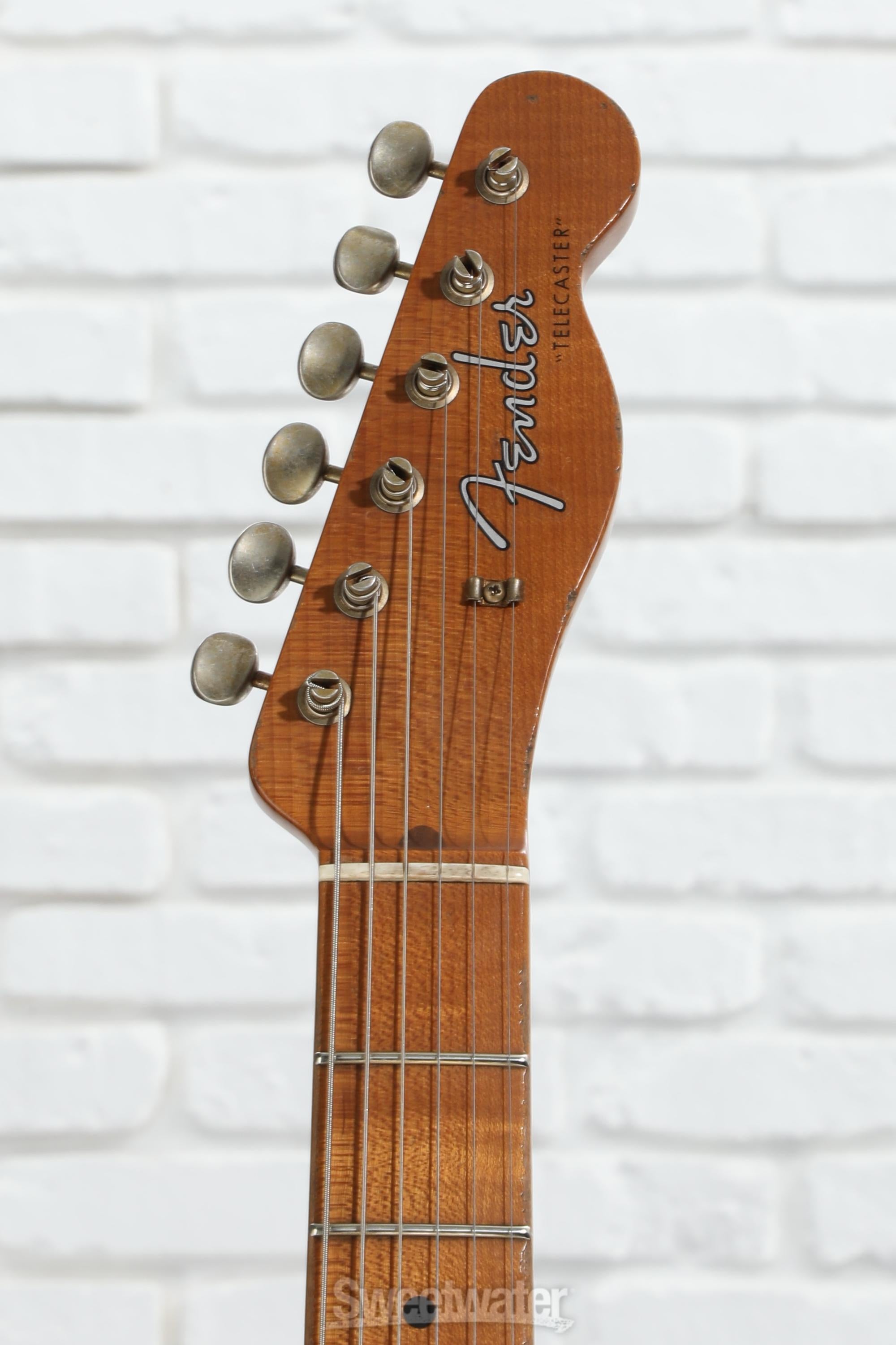 - Ashtray-style Tele bridge with brass saddles, vintage-style tuners, and knurled metal knobs