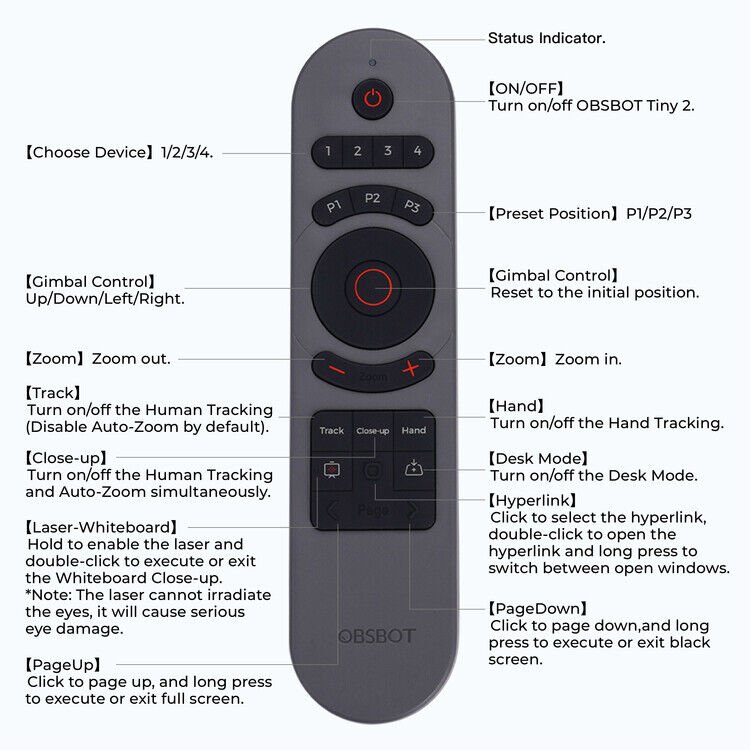 - Smart remote for Tiny series webcams that combines remote control functionality with presentation clicker usability