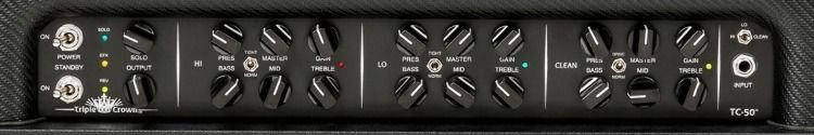 The Mesa Engineering Triple Crown TC-50 50-watt all-tube amp head is Mesa's supreme rock 'n' roll-voiced amplifier. Its 3-channel design offers two modes on each channel for American-sounding clean tones on the first channel, aggressive crunch on the second channel, and thick high gain from channel three. The Triple Crown TC-50 head is also loaded with features such as MIDI-capable switching, a true spring reverb that's footswitchable, and even Mesa's impressive CabClone direct output. The Triple Crown TC-50 head is a versatile amp with a rock 'n' roll soul.