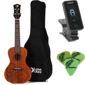 Get incredible design and tone with the Tattoo Mahogany Concert Ukulele from Luna. The Tattoo Mahogany features an all-mahogany body for rich, full tone. A mahogany neck with walnut fingerboard provides stellar playability and response, great for exploring new and interesting uke chord patterns up and down the neck. The Tattoo Concert Uke's design is based on traditional Hawaiian body ornamentation. These geometric patterns all represent the island world of the early Polynesians: waves, fish, birds, and the sun. This particular design is patterned after the Hawaiian turtle, or "honu," a symbol of longevity and endurance. You will get plenty of both with the Tattoo Concert Uke! And be sure to check out the stylized shark-teeth inlay on the walnut fingerboard — we love that feature here at Sweetwater!